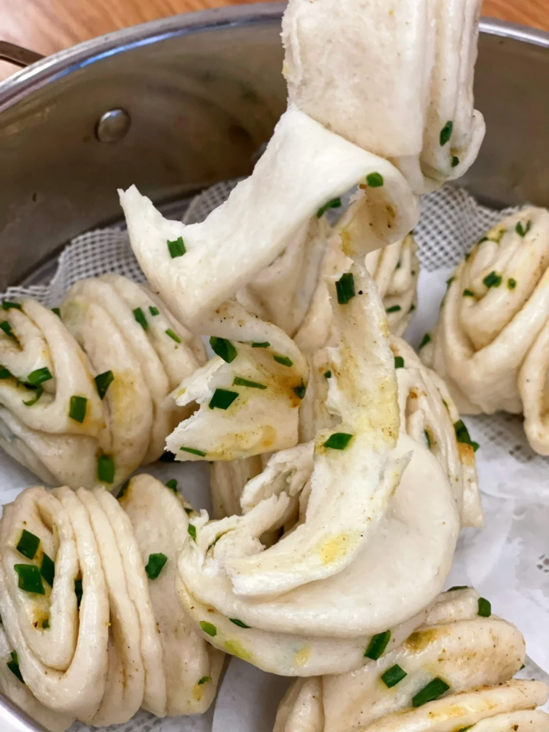 3⃣️:两个小方块叠在一起,用一只筷子从中间往下压,抓住面团两边稍微拉伸一下,再绕手指收口,拧成花卷的形状,冷水上锅蒸15分钟,焖3分钟即可