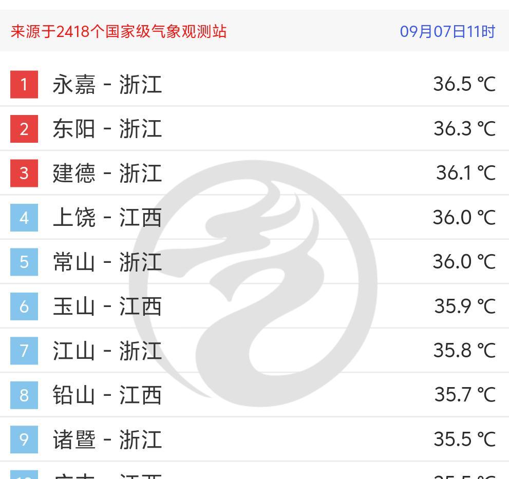 从今天的天气图实况来看,今天副热带高压依然强势控制了南方大部分地区,不仅是华南广东、广西甚至湖北到安徽一带,也都有副热带高压的影响,而且副热带高压的中心都向浙江沿海靠近了,在西部还有高空陆地高压。 从 700 百帕流场图来看,南海的低压系统已经发展成为了今年第16号台风“塔巴” 四川东部到重庆一带处于副热带高压北侧边缘,从 850 百帕流场图来看,还有比较微弱的涡旋环流。 从今天最新的卫星云图上来看,四川巴中到达州以及重庆东北部一带有云层覆盖,但云层也不是特别厚实,广东一带受台风环流影响,云层也开始逐渐增加。 在今天上午11点的全国温度排行榜上,温度排行前十中,都是浙江和江西,而且温度全部达到了高温线标准。 温度排行第一的是浙江永嘉,36.5 度! 排在第十的是江西广丰,温度 35.5 度。 11:50 分,重庆主城沙坪坝温度28.5 度,而且湿度也只有 65% ,重庆垫江温度27.1 度,今天重庆的温度还算是比较舒适。