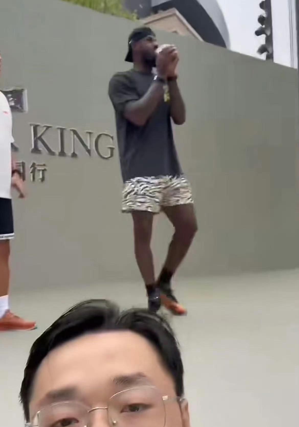 这个球迷胆子真大!詹姆斯中国行成都站,有个球迷在外面捡到一件绿色马甲,随即穿上!