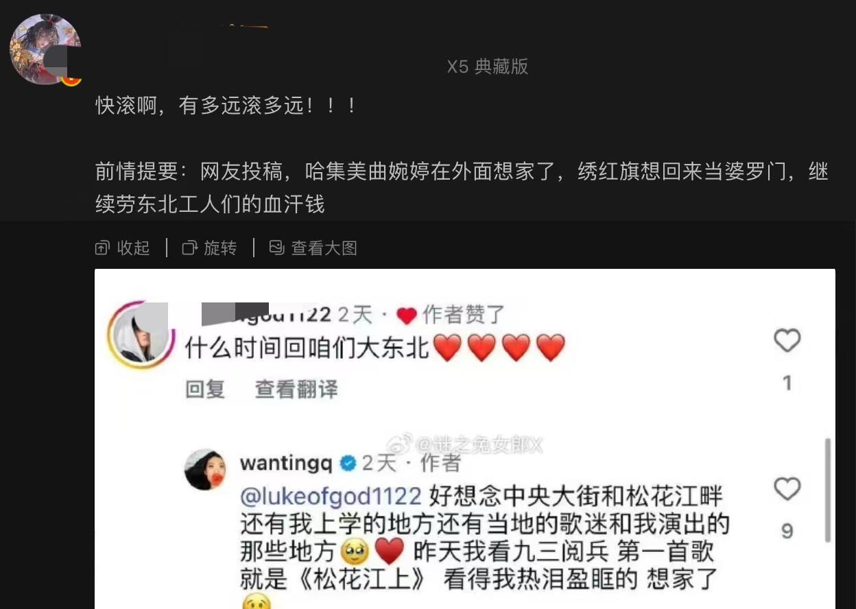 润人看完阅兵居然也热泪盈眶开始想念家乡了?简直有种活久见的感觉!有博主爆料称,著名润人歌手曲某某最近发推表示因看阅兵,听完《松花江上》后热泪盈眶开始想念家乡了。曲某某前些年因其母亲涉嫌犯罪潜逃,而她也跟着沆瀣一气与国内网友硬刚。这些年她基本处在被国内网友抵制状态,她的歌曲作品基本也没有人能去购买欣赏。现在看完阅兵后来这么一出,难道是想传递什么信息吗?当然这条推文是否为网友杜撰不得而知,有国外网友或者可以科学上网的老铁们去其账号下求证一下吗? #秋日生活打卡季#
