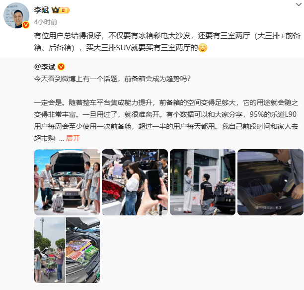 李斌新观点:现在买车,不仅要有冰箱彩电大沙发,还要有三室两厅(大三排+前备箱、后备箱)