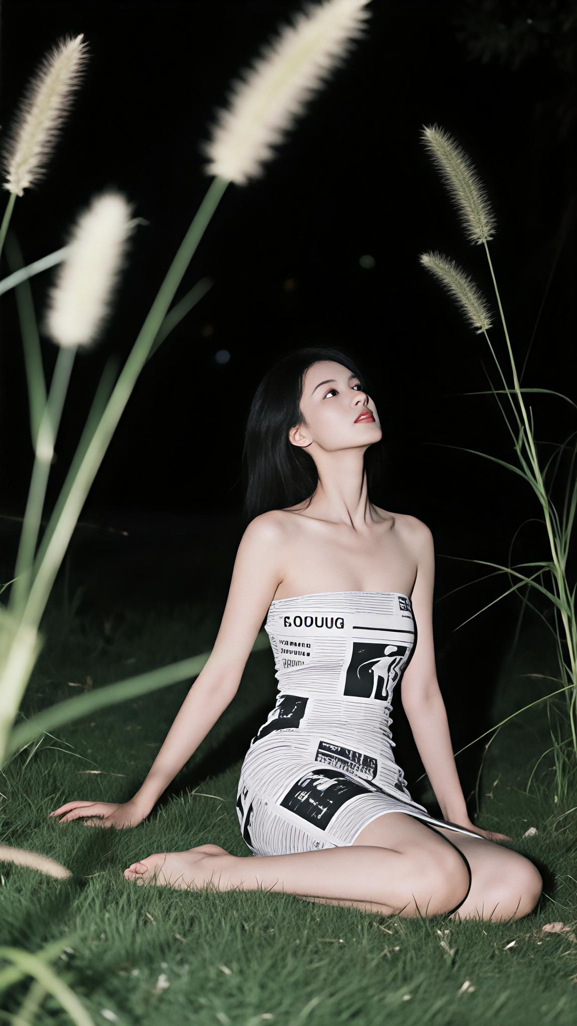 她赤脚坐在草地上,裙身贴合身形,将她的曲线温柔勾勒。