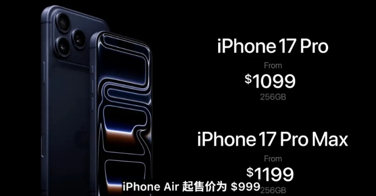 iPhone 17 起售价799美元 iPhone 17 Air起售价999美元 iPhone 17 Pro起售价1099美元 iPhone 17 Pro Max起售价1199美元