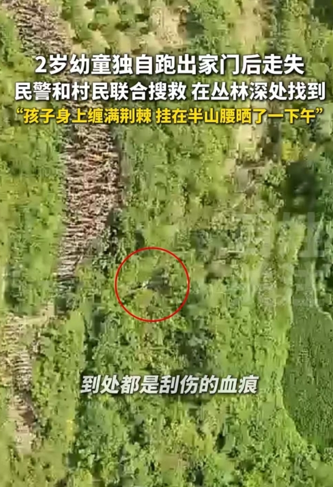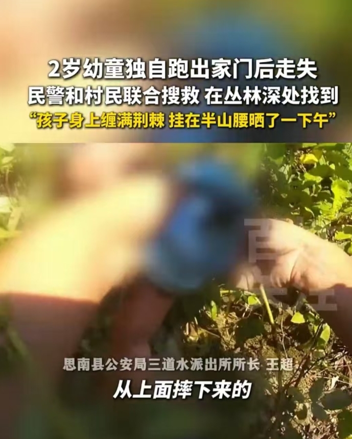 贵州铜仁,两岁的小孩跑出家门,走失后家长苦寻两个小时无果,便赶紧求助民警。民警利用无人机和警犬,在一处半山腰发现了小孩,正被荆棘倒挂在那里,全身都是伤痕,晒得满头大汗。 小孩已经两岁多了,经常会在院子里独自玩耍。当天不知怎么的,家长正在屋里做饭,不一会儿出来就发现孩子不见了。 家长吓坏了,赶紧招呼邻居,大家全部帮忙寻找,可寻找两个多小时都没有找到踪影。 这时有人提议,干脆报警吧,他们有无人机和警犬,这样寻找起来更快一些。 大家排除孩子被人抱走的可能,大概率是摔到哪个角落了;如果孩子处于昏迷状态,呼喊无回应,大家就很难找到。 但有警犬或者无人机,它们可以通过嗅觉和热斑更快查找到孩子。 最后,家长赶紧报警,民警也相当重视。派出所所长王超率队带着警犬和无人机就上山了。 当时的村干部也安排村民们一起上山寻找,因为距离孩子失踪已经好几个小时了,如果再不找到,很可能会发生意外。 最后,王超通过无人机发现了一处半山腰的地方有热斑,顺着这个指引,他们就朝着那个方向奔去,在不远处确实看到了半山腰上挂着那名小孩子。 王超不顾一切,从狭窄的道路上朝下面滑行,来到了孩子的身边,拼命安慰孩子:“勇敢勇敢,不要哭,叔叔来了。” 当时小孩子并没有昏迷,但已经脱水了,毫无力气。很明显,这么大热天,他挂在这里已经晒了一下午。 而当时这些荆棘紧紧缠绕着小孩子的身体,让小孩子无法动弹。也幸好这样才救了孩子一命,也幸好这样让孩子无法动弹,他不至于再朝下面滚落。 最后,王超赶紧把孩子送到医院。检查结果显示一切良好,只是有点皮外伤和脱水,休息一下,补充一下营养就可以了。 这时,家长非常自责,说没有把孩子看好。当然大家都知道这是家长的过错,但也没有过分责怪他们,毕竟小孩子刚学会走路,对什么都有探索欲。 不过两岁的小孩子走路不太稳,事发路段又是一个斜坡,道路不像水泥路那么平稳,上面有很多铺设的小石块,肯定是哪一脚不稳,踩空了就滚下去了。 不过结果是好的,人找到了,安全了,比啥都重要。 依据《未成年人保护法》及《贵州省未成年人保护条例》,未成年人的父母或者其他监护人应当依法履行监护职责;发现未成年人处于危险情形时,应当及时采取保护措施并向有关部门报告。 这件事显然是家长的过失,高估了孩子的安全意识。对方是未成年人,也才两岁,千万不要以为他会乖乖在院坝玩耍,不会到处跑。 幸好结果找到了,幸好孩子没有大碍,要不然家长真的是后悔不已。不过还是希望家长在看管孩子的时候一定不要分心,尽量做到让孩子不要离开自己的视线。 对于这件事,大家又是如何看待的呢?素材来源于百姓关注9月10日报道。