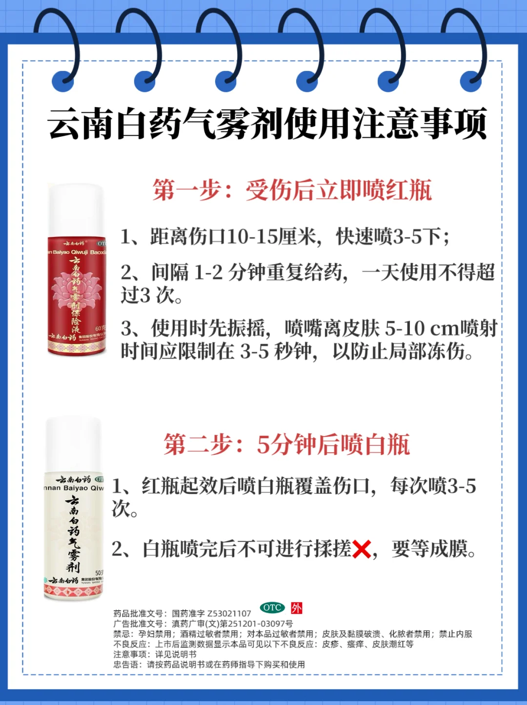 使用的时候先用红瓶在距离伤口10-15厘米,快速喷3-5下,等短时间内降温消肿止🪣后;再用白瓶覆盖伤口持续给力,每次喷3-5秒。