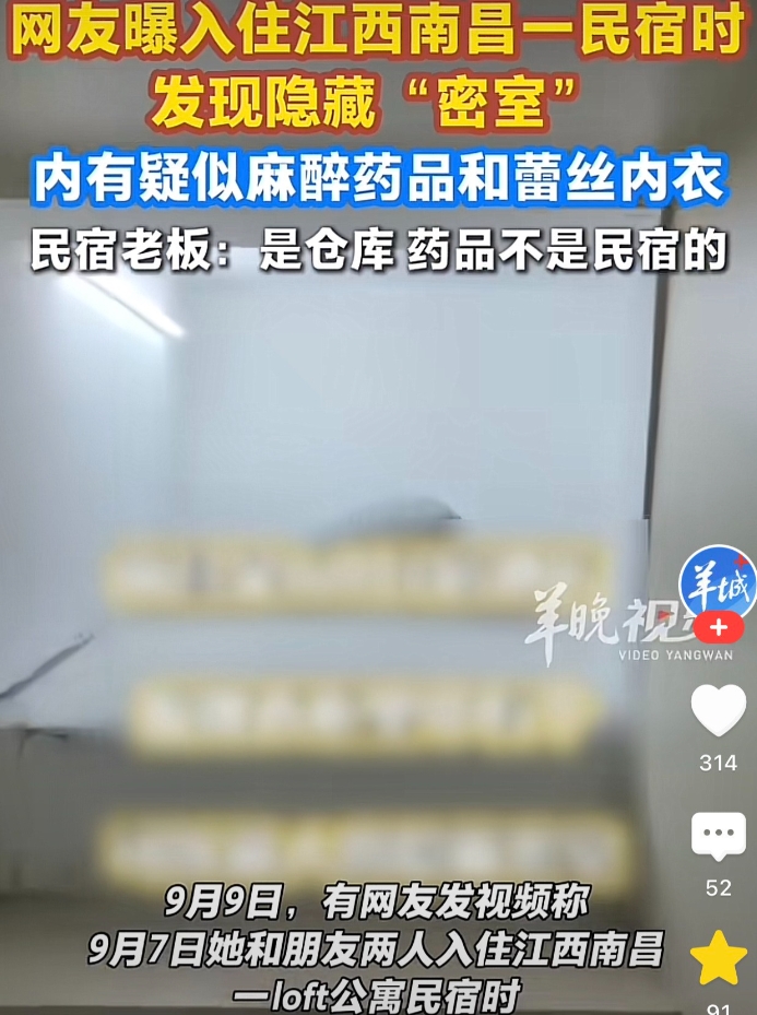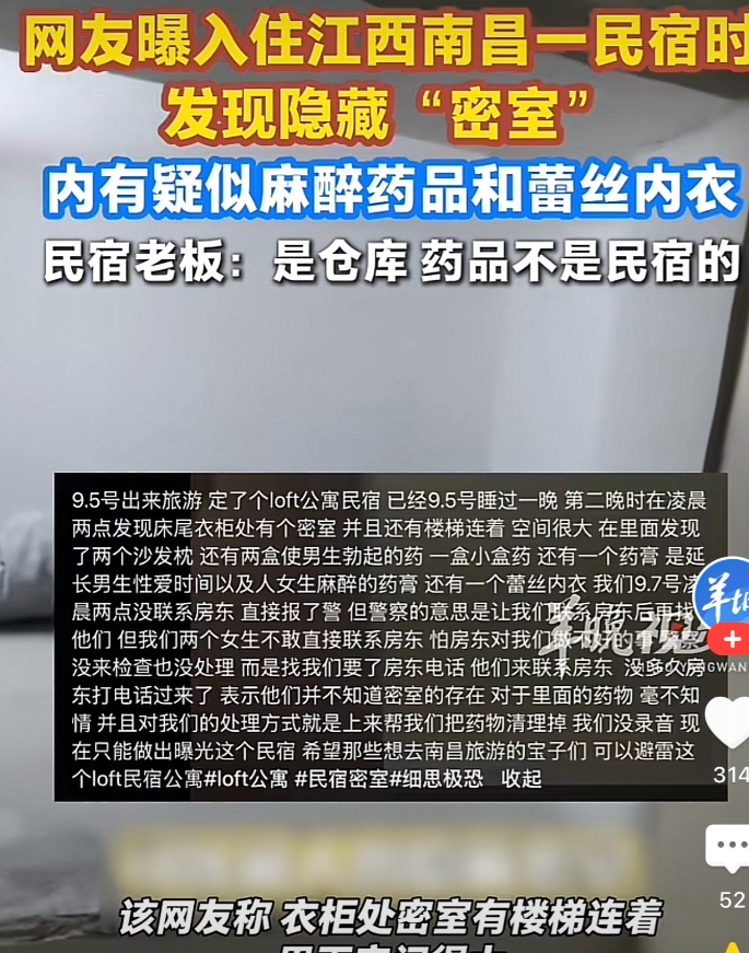 江西南昌,俩女子入住了当地一处民宿,结果第二天的时候,两人竟然在房间里发现了密室,进入密室后,两人又发现了疑似麻醉的药品包装盒以及女性的蕾丝内衣,慌乱之下两人选择了报警,而事后民宿老板坚称自己不知情。