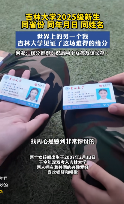 两人同是 2025 级新生,来自同一个省份,出生证明上的日期完全一致——同年、同月、同日,连出生时辰都相差无几。 更令人称奇的是身高,他们的身高也相差不大,当导员在新生名单上发现这两个完全相同的名字和近乎一致的信息时都忍不住质疑,直到两人出现才确信这是真实存在的奇妙缘分。 若说身份信息的重合是 “天定”,那外在形象,则更像是一场无需约定的 “默契同步”。她们都留着齐肩长发,简单梳理后自然垂在肩头;脸上都架着一副黑框眼镜。再加上身上穿的是学校提前发放的迷彩军训服,两人惊人地相似。 这种 “复制粘贴” 般的相像,让初次见面的两人都倍感惊讶。她们对视时,都从对方眼里看到了自己的影子,那种熟悉感远超普通的陌生人。 当她们并肩站在一起时,周围的新生忍不住拿出手机拍照,她们也乐于将这件事分享出来,网友纷纷留言:“这真的不是双胞胎吗?连举手投足都一模一样!” 没有刻意模仿,没有提前沟通,却在姓名、出身、外形上达成了近乎完美的重合。这种巧合,早已超越了 “有缘” 的范畴——就像两条原本平行的直线,被命运的手轻轻一推,便在吉大的校园里精准交汇,以最相似的姿态,开启了崭新的大学旅程。 而这份刻在骨子里的相似,也成了她们之间最特别的纽带,让彼此在陌生的校园里,第一眼就找到了 “另一个自己”。 当被问到未来的打算时,她们异口同声地说:“希望能一起努力,在吉大度过充实的四年,也希望这份缘分能一直延续下去。” 或许就像网友说的那样:“有些相遇,从一开始就注定不凡。” 这两位在吉大相遇的王韵涵,用一场跨越人海的重逢,告诉我们:生活总有不期而遇的温暖,和生生不息的希望。而这份 “天选之缘”,也将成为她们大学生涯中最珍贵的回忆,在岁月里闪闪发光。