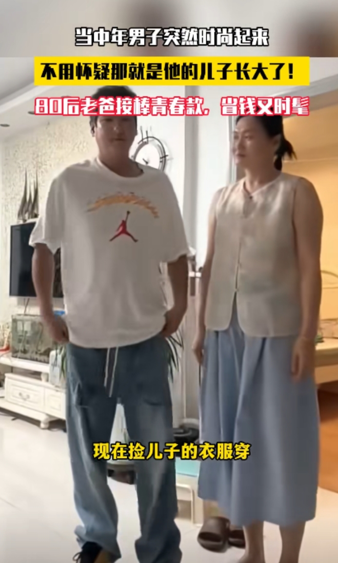 笑不活了!”江苏,妻子准备将儿子淘汰衣服扔掉,不料,却被丈夫拦下!说不要浪费,然后就把儿子的衣服穿上,主打青春派,原来,儿子17岁,身高是一米八,淘汰下来好多衣服裤子,包括鞋子,丈夫都可以穿。