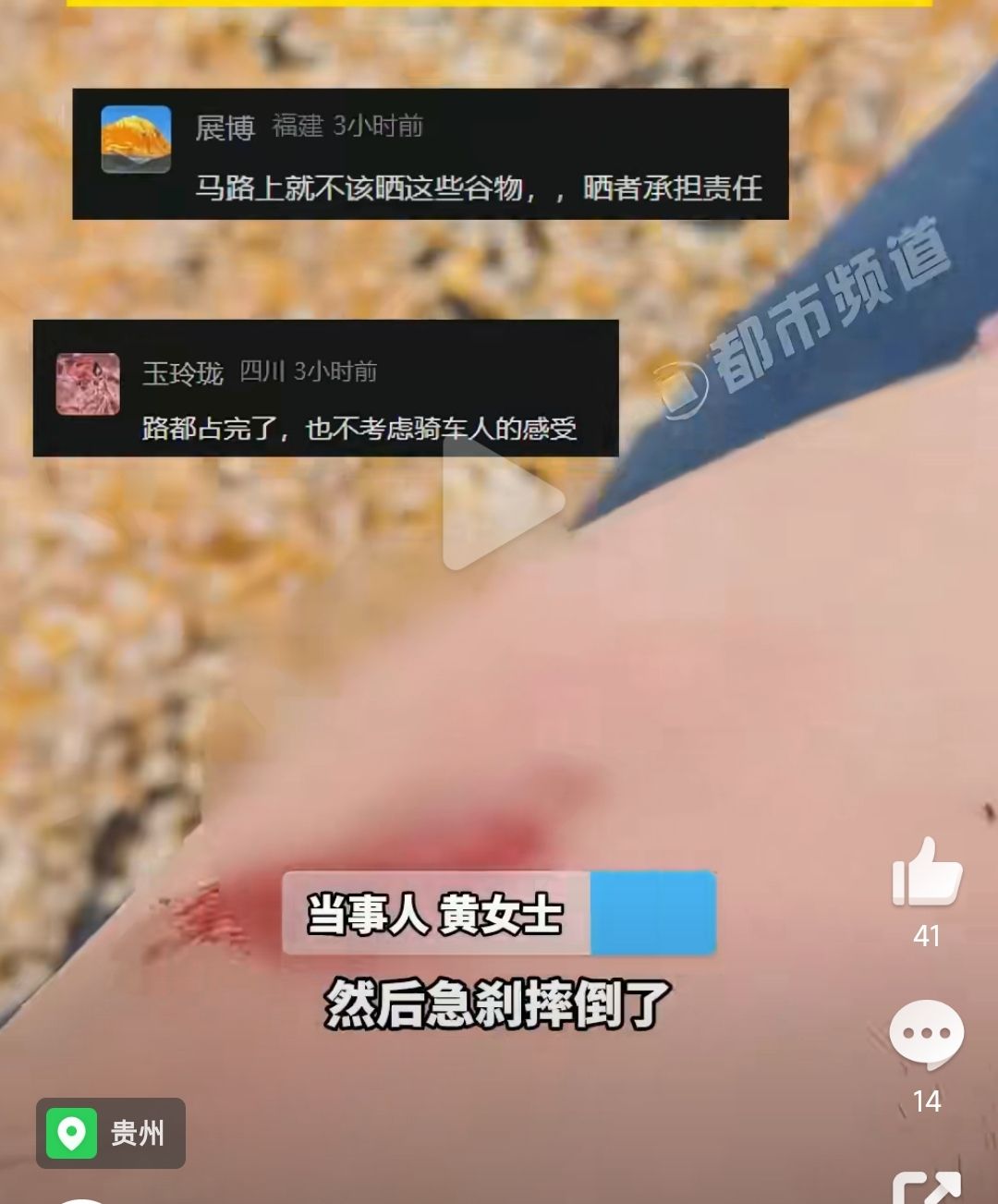 视频发到网上,有网友心疼道:“这也太委屈了!马路上晒东西太坑人了,远看真的容易认错,为了不压玉米急刹车摔了,还想着别人不容易,姑娘心也太好了。”还有人说:“马路是大家走的公共地方,哪能随便占着晒东西?这不仅违法,万一骑车的、开车的没注意,出大事可咋办!”