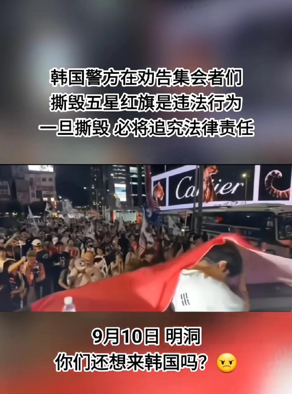 韩国警方劝告集会者们撕毁五星红旗是违法行为 ,一旦撕毁必将追究法律责任 他们的傲慢会在一次次失意中撕裂,腰也会弯向曾统治他几百年的宗主国。这些废材,听到警察的话,居然又怂了。这就是为什么更支持李在明的原因,因为他至少聪明一点,要是换了尹锡悦,估计根本不会去管这事。 其实看到这个还有一点点开心,这说明我们国家日益的强大了,不断的压缩这些小国的生存空间,我们还需要继续努力工作,把国家建设的更好,让这些人无路可走。吸掉他们所有的国际资源。在每一个行业,在每一个产业,都全面的去抢占他们在全球的份额。让他们的GDP缩减90% 放到400多年前,藩属国这样对宗主国,会被锤出翔的,放到2000多年前是会被灭国的