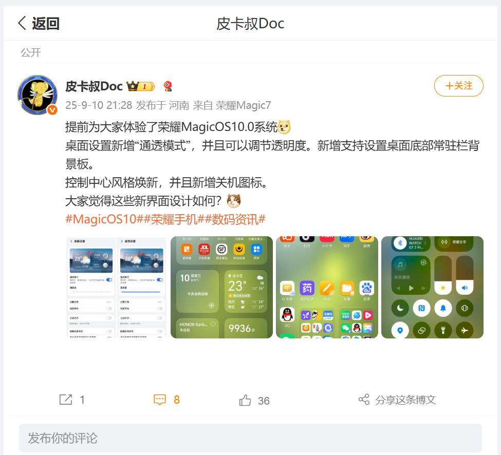 刚刚看到@皮卡叔Doc老师,参加了荣耀MagicOS10.0系统内测活动,第一时间分享了自己的使用体验,我也比较喜欢他推荐的通透模式,从视觉效果上来看,风格焕新UX界面,让交互体验感也变的新鲜,还支持隐藏应用名称功能,控制中心居然还有关机按钮?#万能生活指南##畅聊数码新品##数码资讯#