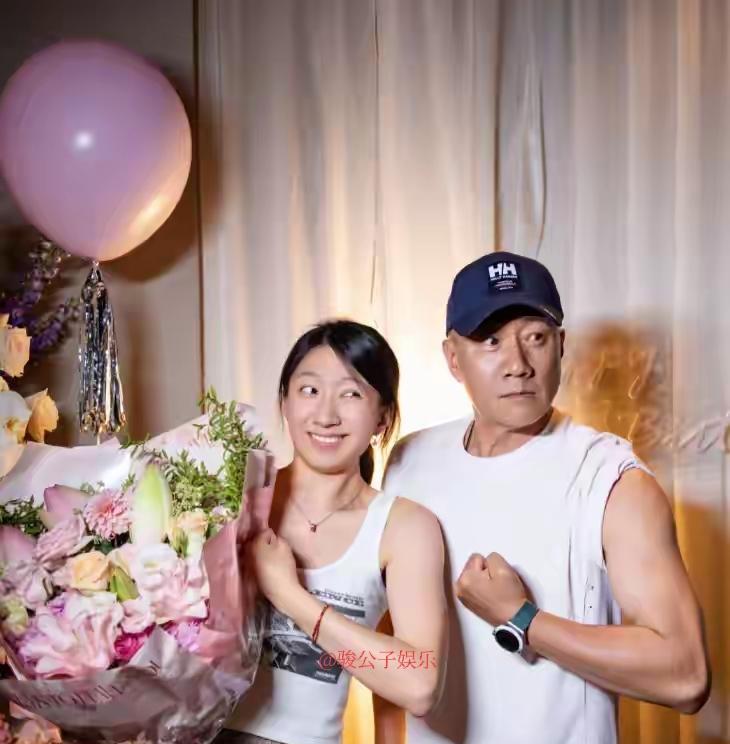 胡军一家为女儿庆24岁生日。九儿手捧鲜花站在爸爸胡军与弟弟康康中间,笑容明媚;胡