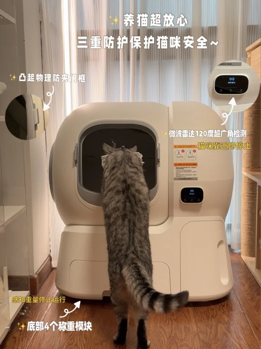 大家最关心的安全问题也不用愁,它有三重防护,猫咪靠近机器会立刻停止运行,物理+双重电子感应防夹,超级安全,出去玩一周都能放心。
