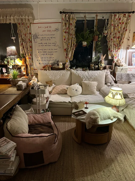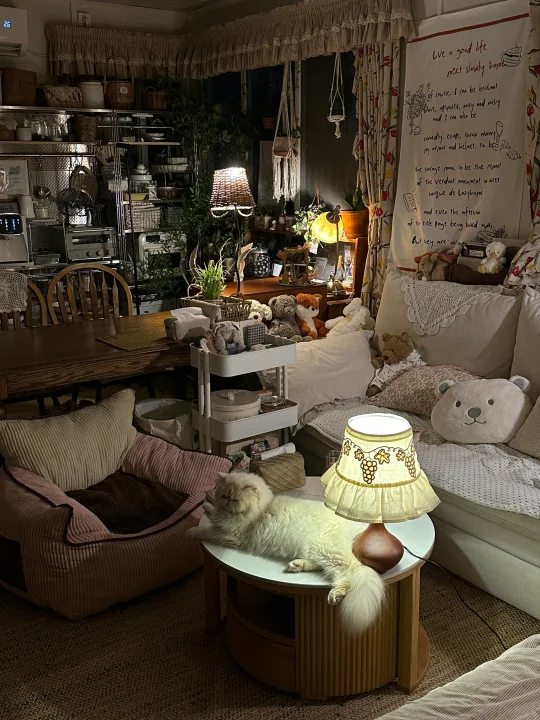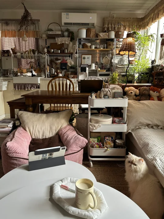 沙发旁的小推车摆着常吃的零食、猫咪的玩具