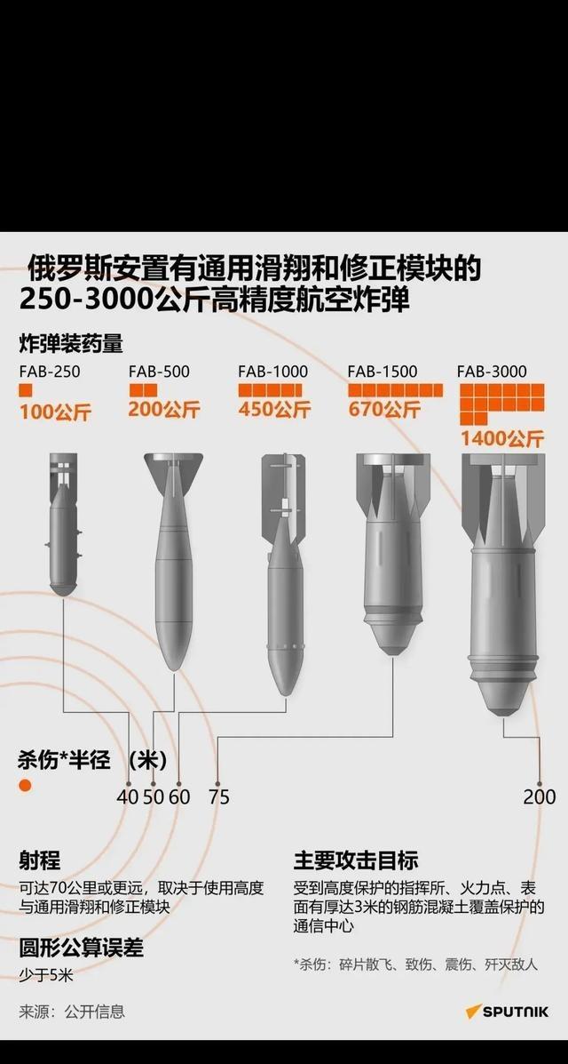 事实证明导弹威力并没有军迷想象中的那么大。别看一枚导弹重一两吨,但基本都是燃料、发动机、导航系统等,战斗部也就四百多公斤,装药在100公斤左右。 再想想航空炸弹,这东西不需要内置发动机和长距离导航,纯粹靠飞机扔下去,所以能塞更多炸药进去。一枚250公斤的航空炸弹,炸药量轻松上100公斤,跟一吨重的导弹差不多,但成本呢?才一两万美元,便宜到能批量生产。俄罗斯的FAB系列就是典型例子,FAB-500重500公斤,炸药占一半,破坏范围不小,却不用担心燃料消耗。 军迷们容易忽略这点,总觉得导弹高科技,威力自然大,但数据摆在那儿,航空炸弹的性价比高多了。尤其在现代冲突里,像俄乌战场,俄罗斯一开始用导弹轰击高价值目标,比如指挥中心或雷达站,可库存有限,每枚上百万美元,很快就用不起。 转而大量投航空炸弹,一天几百枚,效果反而更好。 当然,这不是说导弹没用。它适合打那些防空严密的点目标,比如航母或地下指挥所。航空炸弹扔得近,飞机容易被击落。但在成本上,导弹贵得离谱,一枚Kh-101要1300万美元,而同等炸药量的炸弹只要几千刀。 俄罗斯在冲突初期狂用导弹,结果库存见底,只能转向改装炸弹,加滑翔套件,让飞机从60-70公里外扔,避免被防空导弹盯上。 其实,全球军队都面临类似选择。美国在越南用过大炸弹,GBU-43重9吨,炸药8500公斤,威力相当于鱼雷的200倍。 但导弹呢?战头小得多,因为任务不同。军迷容易被宣传误导,以为导弹越大越好,忽略了设计权衡。燃料和导航占重,战斗部小是必然。 展望未来,导弹会更智能,但战斗部大小难变。俄罗斯恢复FAB-3000生产,产量翻倍,就是因为便宜实用。 乌克兰战场上,这种炸弹给防线重创,导弹则留给关键点。 总的来说,这事儿告诉我们,武器不是越大越好,得看怎么用。导弹精密,但炸药少;炸弹粗糙,却实惠猛。军迷误区多源于电影和游戏,现实中,成本和效率决定一切。俄罗斯的战术转变,就是活例子,从导弹到炸弹,维持了空中优势。