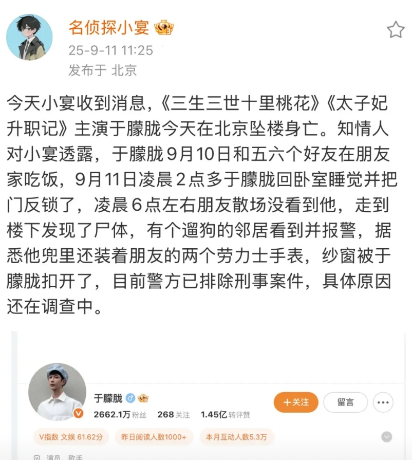 9月11日,狗仔爆于朦胧今天坠楼身亡! 警方排除刑事案件,也就是说他是自己跳下去