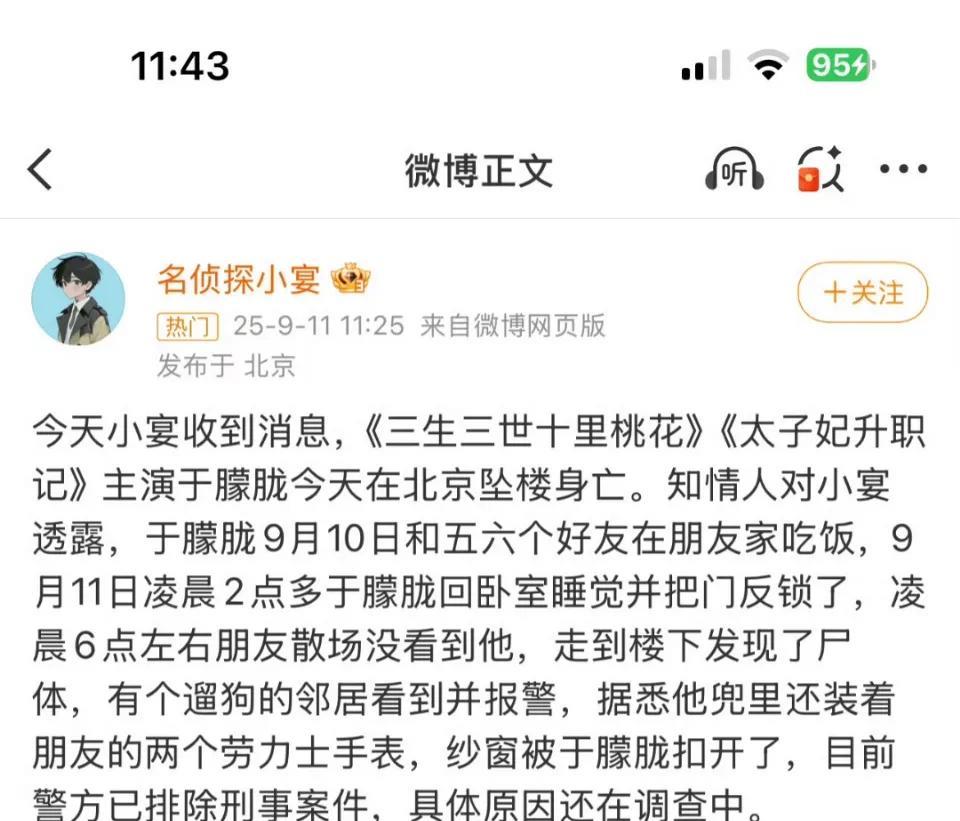 网传男演员于朦胧坠楼身亡! 9月11日,网传演员于朦胧坠楼,称其9月10日聚餐后反锁卧室,次日凌晨被小区居民发现坠楼,警方已排除刑.事案件。随后,疑似事发小区物业回应称确实有人坠楼,但不确定是否为明星。 于朦胧的朋友给于朦胧打电话,于朦胧手机关机,微.信不回。今年6月15日于朦胧生日时朋友曾联系过对方:“当时我祝福他生日快乐,他也有回复,没有任何异常。我也希望能够尽快联系上他的家人,了解真实的情况。”消息引发热议,多位网友呼吁其本人或工作室出来澄清。 疑似于朦胧助理在社交平台发文:这世道怎么了,那么完美……应该是真的出事了,不然肯定会辟谣。