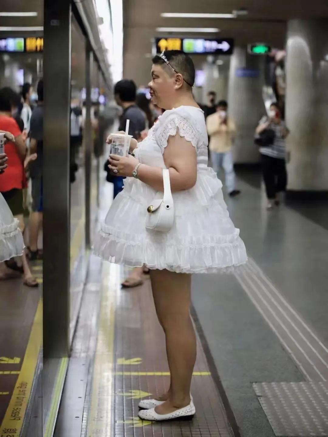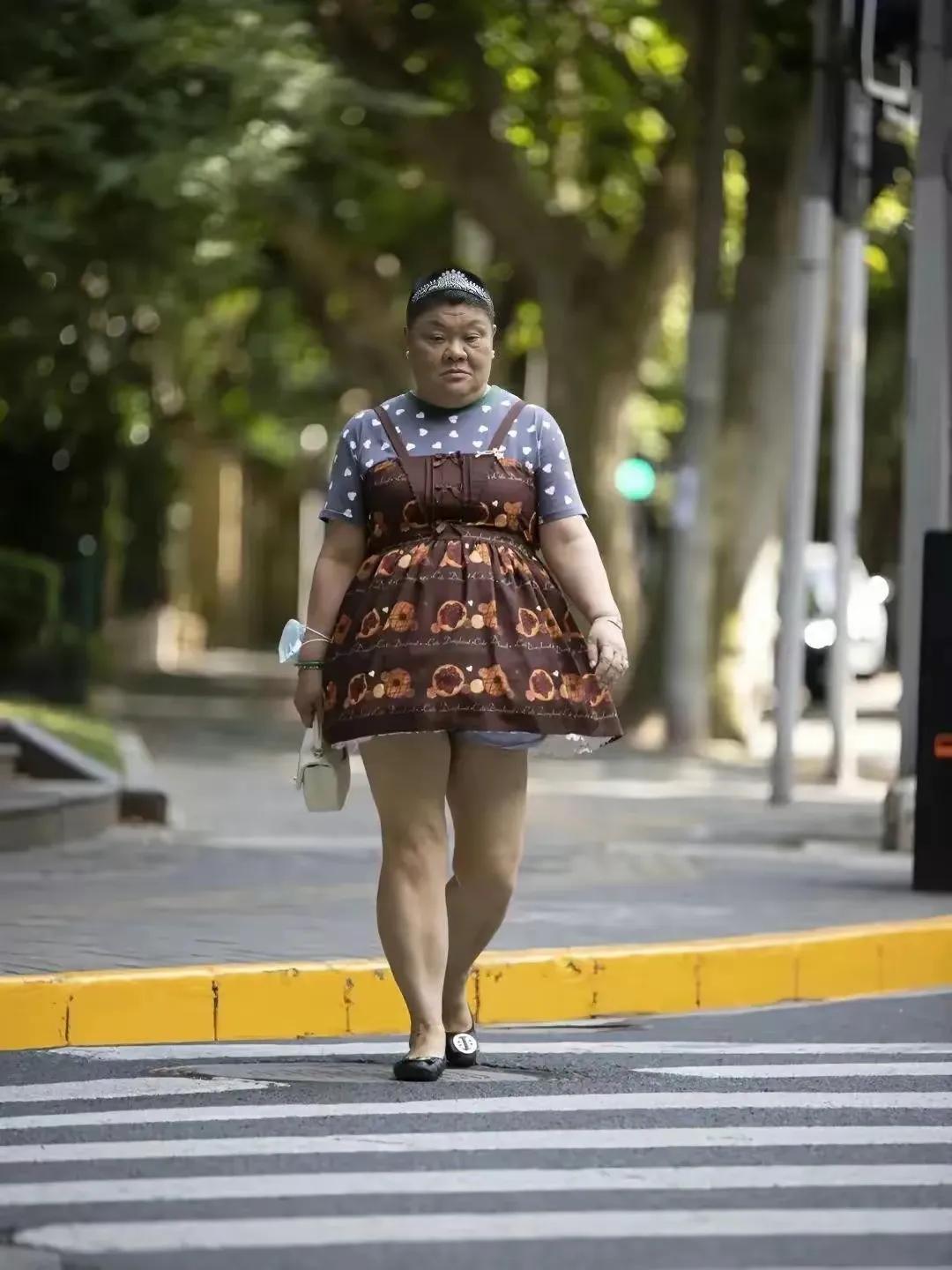 在喧闹的街市间,一个穿着白色蓬松公主裙的“50岁阿姨”走过人群,吸引了无数眼球。