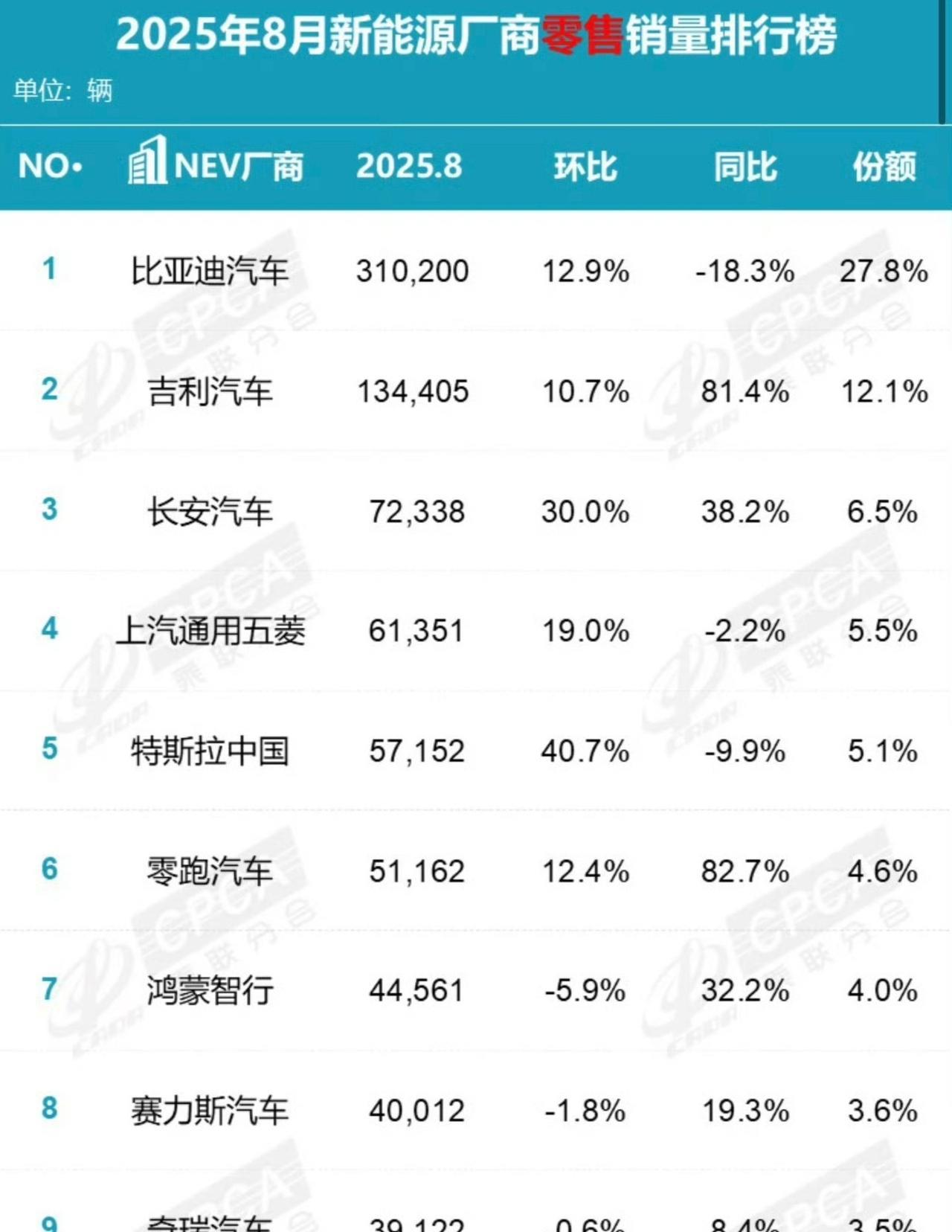 新能源汽车排行榜: 比亚迪、吉利、长安、五菱、特斯拉、零跑、鸿蒙智行、赛力斯、奇瑞、小米……