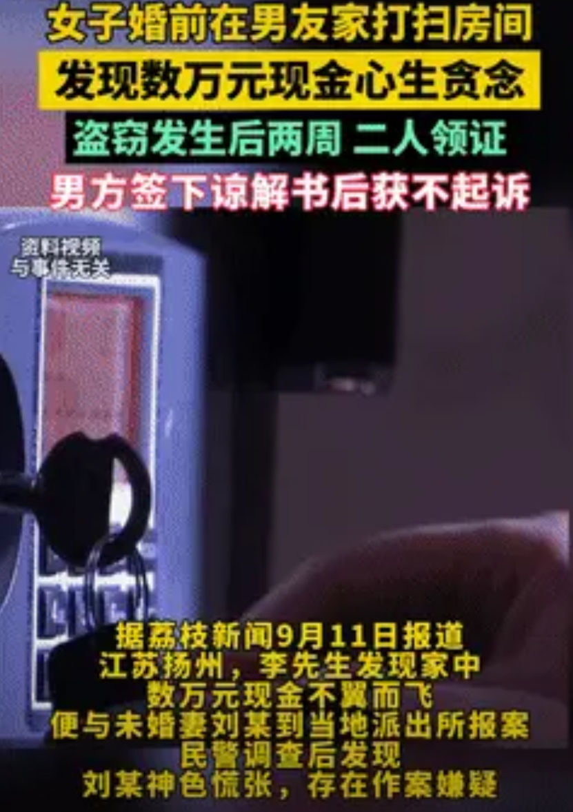 万万没想到!江苏扬州,一女子婚前打扫男友房间时,发现抽屉里有数万元现金,便心生贪念,将钱给偷走,事后,女子还假模假样陪男友去报警,而在两周后,俩人还领了证,但后面事情还是败露了,可男友的做法,却让人意外! 2024年12月27号,扬州江都区的李先生遇到了件糟心事,自己藏在婚房里的数万元现金不见了。 找了半天没找着,他心里着急,就拉着未婚妻刘莉一起去派出所报案。 谁能想到,民警调查的时候,发现刘莉神色特别慌张,问着问着,刘莉就承认钱是她偷的。 原来,之前两人订婚后一起打扫婚房,刘莉无意间发现了李先生藏的现金,当时就起了贪念,把钱拿走了。 后来她把一部分钱花了,剩下的大部分都存进了自己的银行卡里。 更让人意外的是,刘莉因为盗窃被调查,还在取保候审期间,就跟李先生按计划领了结婚证,从未婚妻变成了合法妻子。 按说,根据我国《刑法》第二百六十四条,刘莉这行为是非法占有他人财物,而且数额巨大,要是按正常情况处理,可能得判三年以上十年以下有期徒刑。 可最后当地检察院却做出了不起诉的决定,这事儿一出来,网上就吵翻了。 负责这个案子的检察官解释说,虽然刘莉偷钱的时候两人还没结婚,但偷完两周就领了证,成了法律上的家庭成员。 根据相关司法解释,家庭成员之间偷东西,要是能获得谅解,一般可不按犯罪处理。 加上刘莉是第一次犯事,钱也退了,还认了罪、悔了过,李先生也原谅了她,后来又找了人民监督员、律师代表和社区工作人员一起听证评议,大家意见一致,才决定不起诉的。 可这解释没让所有人信服。 有不少人觉得,订婚又不算家庭成员,偷钱是婚前干的事儿,怎么能因为婚后领了证就不算犯罪了?这结婚证难道成了“免罪金牌”? 还有人说,这事儿换个性别可能就不一样了,要是男的偷了女方家的钱,这婚肯定结不成。 现在不少大龄男性婚恋压力大,好像只要能找到对象,对方犯点错也能忍,这也太委屈李先生了。 说起来,李先生也够冤的,自己藏点钱,没招谁没惹谁,被未婚妻偷了,最后还得原谅对方,甚至继续结婚。 虽然他自己可能愿意原谅,但这事儿确实得提醒大家,婚前财产保护真不能大意。 大额现金别随便藏在婚房这种两个人都能接触到的地方,要么存银行,要么跟对方签个协议说清楚,免得以后出麻烦。 要是真发现东西被偷了,第一时间就得固定证据,别因为是亲密关系就犹豫,不然到最后可能连自己的权益都保不住。 再说说法律层面,不是说家庭成员之间的盗窃不能管,但得看清楚情况。 像刘莉这种,偷钱在前,结婚在后,还赶在取保候审的时候领证,难免让人怀疑是不是想靠结婚脱罪。 法律既要考虑家庭和谐,也不能让“结婚”变成规避责任的空子。 以后遇到这种事儿,得先看偷东西的时候两人是什么关系,而不是看后来有没有结婚,这样才能让大家心服口服。 还有,刘莉这行为也挺不地道的,订了婚就该好好过日子,怎么能因为见了钱就起贪念? 就算最后没被起诉,这事儿也成了两人婚姻里的一道坎。 婚姻最讲究的就是诚信,要是连这点信任都没有,这日子八成长久不了。 总的来说,这案子之所以争议大,就是因为大家担心法律的公平性被破坏,也心疼李先生的遭遇。 希望以后司法部门处理类似案子的时候,能把标准定得更清楚,别让“结婚证”成为某些人犯错的“保护伞”,也得提醒更多人,不管是婚前还是婚后,都得守好法律和道德的底线,保护好自己的合法权益。