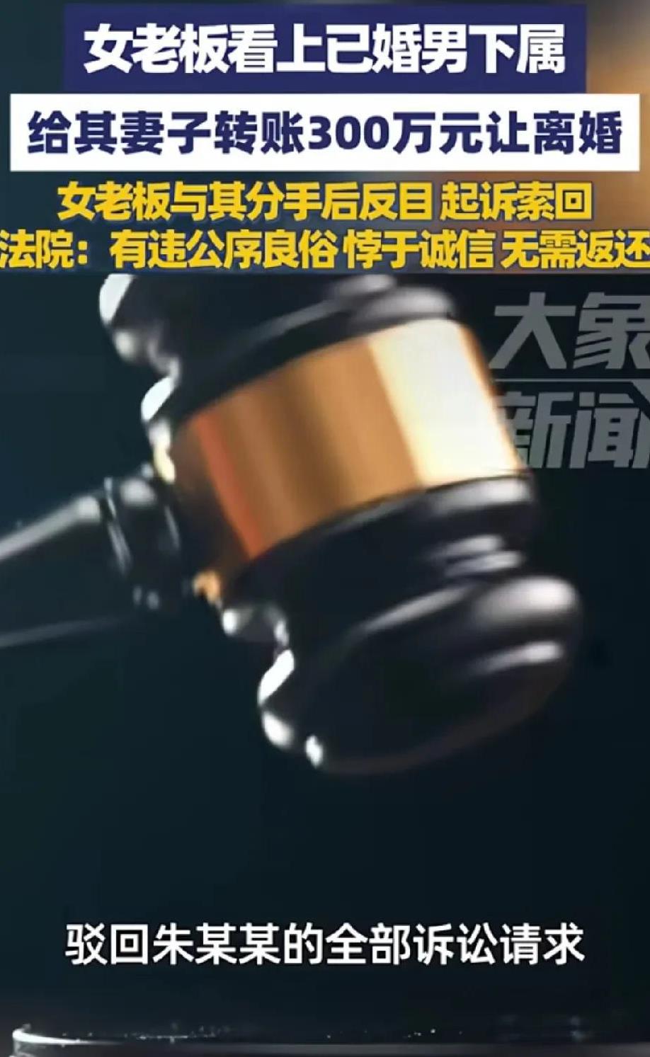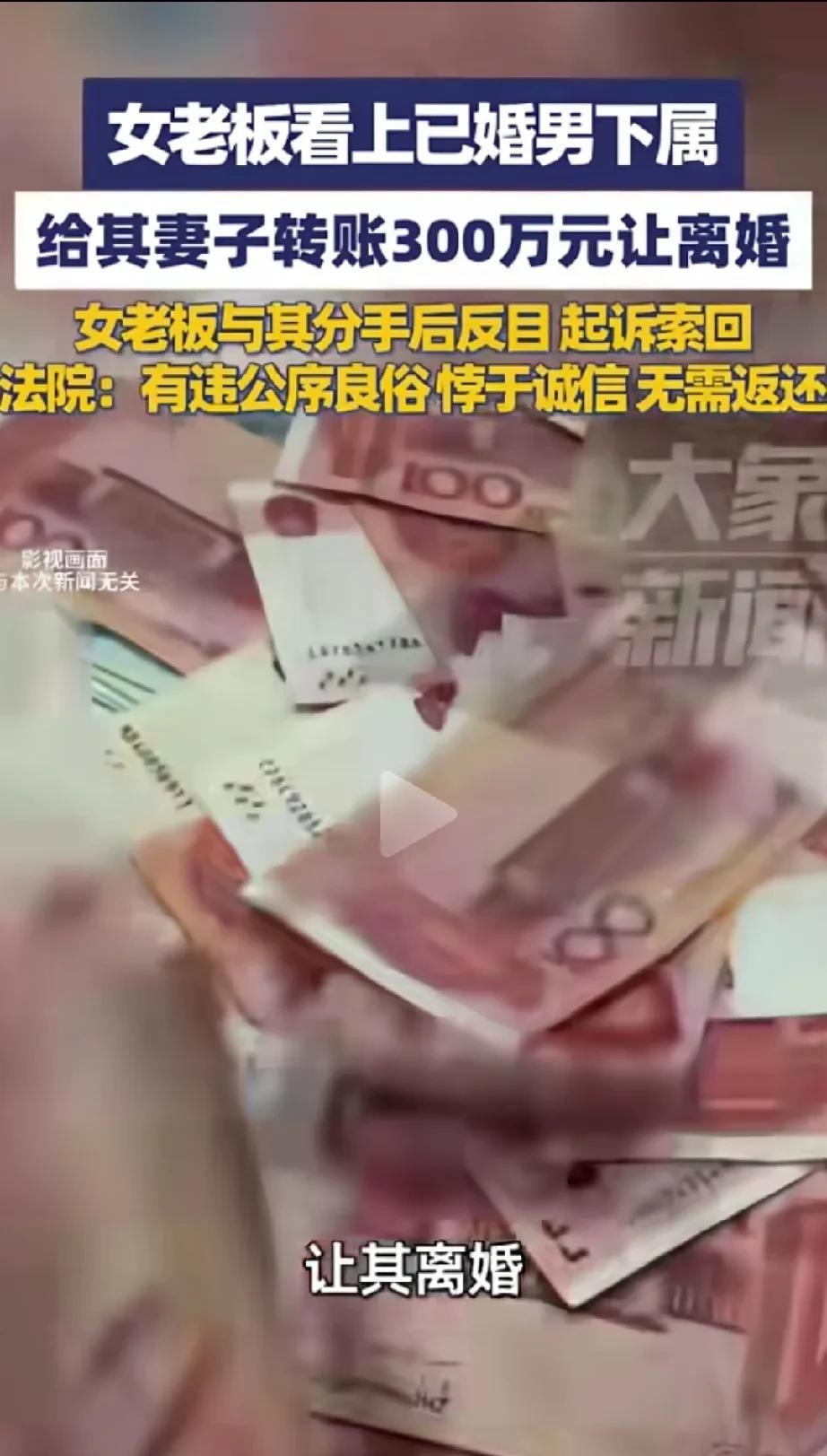 砸300万让人离婚还想索回?这次必须给法官点个大赞[赞]! 近日,一女老板因为看上了已婚男下属,想和他结婚,就给这位男下属的妻子直接打了300万现金,让她与老公离婚和自己结婚。 之后这个女老板和这位男下属生活了一段时间,发现不合适,就想分手,然后就向法院起诉,要这位男下属和他的前妻返还之前给的300万元。 但是法院根据相关的法条,一审判定这种情况,属于违反公序良俗,有悖于诚信,故判决无需返还。 信息来源:大象新闻 @猿方有看法 从这300万元来看,当时这个女老板去对这个男下属确实是情有独钟的,否则的话也不会一下拿出这么多钱,让他老婆离婚。 因为如果是不差钱的话,人家老婆已经离过婚成了前妻了,怎么也不会好意思再找人要回这300万。 而且根据法院的判决理由,女老板这种直接拿钱砸的行为是违反公序良俗的,虽然说女方接受了她的钱财,也和丈夫离了婚,但是这个女老板和男下属因为生活合不来,再分手的时候,就已经和男下属离婚的前妻没有任何关系了,所以法院是不支持这种索回要求的,这里要给法院点个大大的赞。 各位网友,怎么看这个事呢?欢迎评论区留言讨论