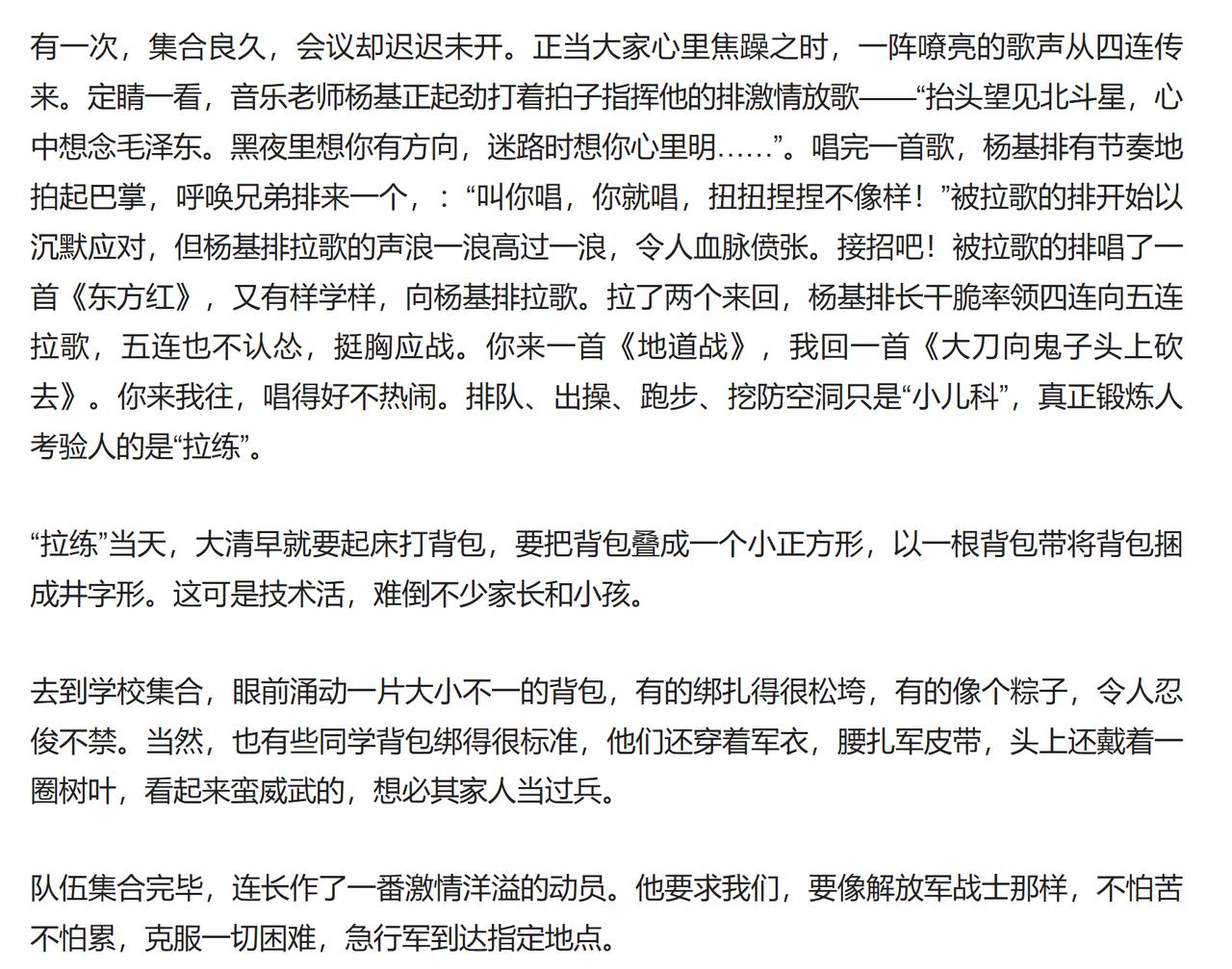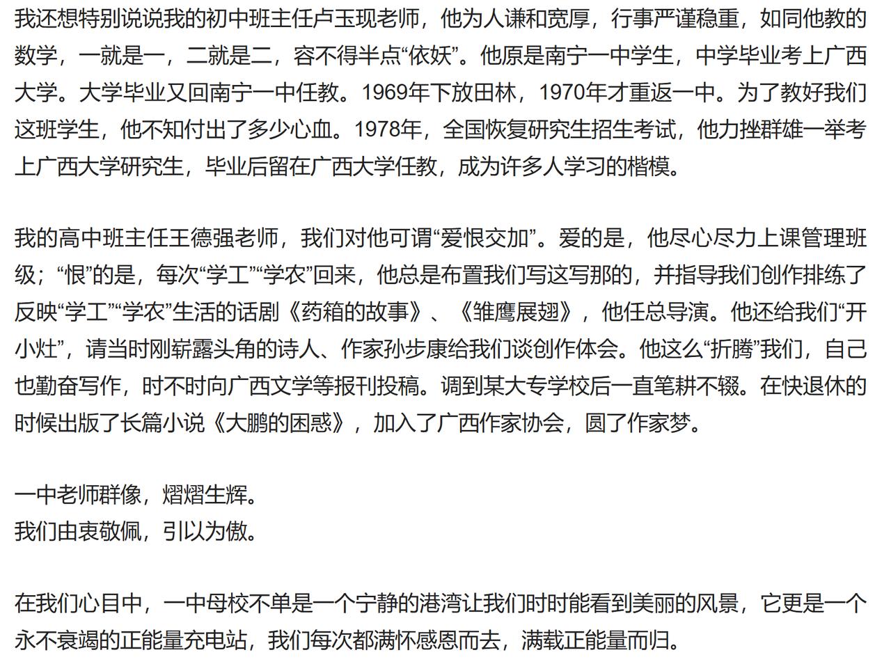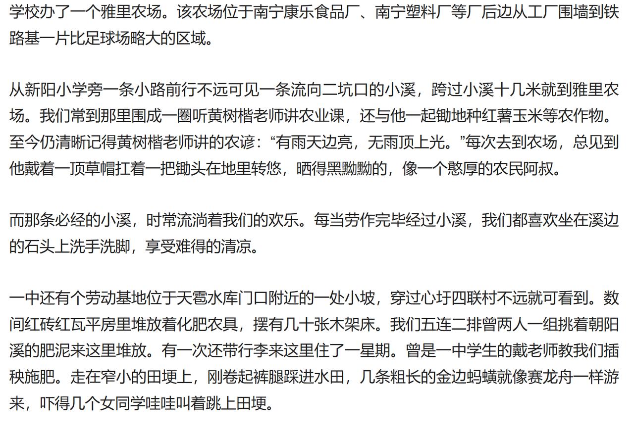 “开门办学”的苦与乐 编者按:感谢作者的这篇文章,使我们知道中学“老三届”离校之后,上世纪七十年代普通中学的“开门办学”,就是把社会实践当作学生的主要课程,课堂教学时间大幅减少。这种模式虽增强了学生的动手能力,但导致基础知识体系断裂。这与老三届的以学习科学知识为主,注意知识传承而社会实践为辅倒转过来了,这段历史警示我们:教育改革需尊重教育规律。 (作者韦云翔)“开门办学”是特殊时期推行的以生产劳动、政治运动、社会活动、军事训练等替代文化课的教育实践形式。“学工”“学农”“学军”是其主要内容。我们这一代人,或者说我们这一批人,生逢其时,接受了它独特的“教育”。它注入了太多的元素,我无法说清它好与不好。 十三四岁,含苞欲放的年纪,本该有充足的光照和雨露的滋润,我们却早早步入社会,承受了过多的风霜雨雪磨炼。 我们在“开门办学”中学到了许多课本上没有的东西,我们会插秧、种红薯、养猪、打背包、拉歌……可是,在挥洒汗水的时候,我们的青春花季已不知不觉悄然滑过。 (作者韦云翔,南宁一中七四届学生。1979年考入北京师范大学中文系,1983年大学毕业入职南宁晚报、南宁日报总编助理、编委、主任编辑。多篇作品获全国晚报新闻奖、广西新闻奖。获中国新闻工作者协会颁发“从事新闻工作三十年”荣誉证书证章)。