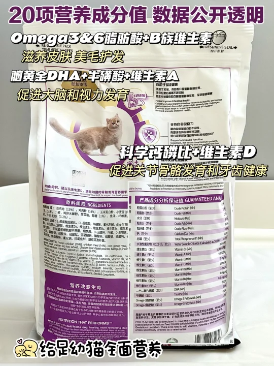 而且冠能幼猫粮营养丰富 富含44种营养素 营养保证值足足有20项 像科学钙磷比+维生素D助力骨骼关节发育 Omega3&6+B族维生素呵护皮肤和毛发 DHA+维生素A+牛磺酸,帮助大脑和视力发育 全方位满足幼猫成长所需