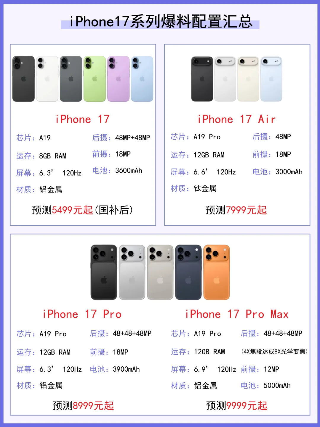 📱关于4款新机的目前爆料配置我给大家整理在P2了,这里预测一下iPhone17系列的价格