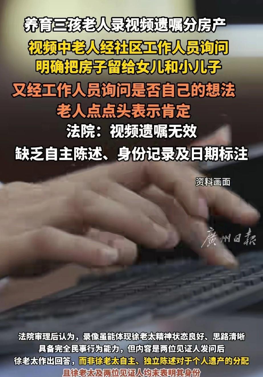 上海,老人有三个孩子,二女儿和小儿子非常孝顺,一直在床前尽孝,把老人照顾的无微不至,但大儿子却很少出现在老人面前,更别说尽孝了。老人心寒,去世前在居委会工作人员见证下,录下一段视频,明确表示房产就给二女儿和小儿子,不给老大。谁知,老人去世后,大儿子不愿意了,觉得视频不真实,没有明确身份,也没有说明时间,不能算数。于是,三兄妹为了房产闹上法庭,法院的判决让人意外。 陈大爷和徐老太感情恩爱,共养育了三个孩子,陈某是老大,下面还有二妹和三弟。 父母去世后,留下一套房产,这套房子共同登记在陈某和三弟名下。 本以为看在骨肉亲情的份上,父母走了,几个人也能和睦相处,万万没想到,老母亲前脚刚走,兄妹三人就因为房产继承问题闹得不可开交。 陈某认为,房子在自己和三弟名下,不说他们两人平分了,起码兄妹三人分。 但是二妹和三弟却表示,母亲临走之前专门交代过,因为大哥不孝,所以这套房子没有他的份,只留给他们二人。 陈某一听瞬间炸了,他从未听母亲说过这茬事,而且自己也是亲儿子,还是长子,他相信母亲不会如此绝情。 他觉得弟弟妹妹就是为了霸占财产,故意撒谎,于是,一气之下将两人告上法庭。 案件审理过程中,三弟提交了一份视频,是母亲生前在居委会工作人员的见证下录制的。 视频中,徐老太坐在两位居委会工作人员中间,工作人员询问想把房子留给谁? 徐老太明确表示,房子留给二女儿和小儿子,不愿意留给大儿子,因为二女儿和小儿子尽心尽力照顾自己,而大儿子从来没有尽过赡养义务。 工作人员又问:这是您自己的想法吗?徐老太表示肯定。 原来,二儿子和小女儿特别孝顺,平时只要一有空,就会跑到父母床前尽孝,端茶送水,擦身喂饭,忙前忙后,亲力亲为,把老人照顾得无微不至。 可大儿子陈某,不是说他工作忙,就说家里有事,很少出现在老人面前,更别说尽孝了。 老人非常寒心,自己辛辛苦苦攒了这么一套房子,可不能稀里糊涂地给了这个不孝子。 于是,她找来了两位居委会的工作人员,录制了这个视频,把自己的想法说清楚。 本以为有了这个视频,房子的事就能按照自己的意愿来处理了,可没想到,还是出了岔子。 一看视频,陈某暴跳如雷,他当场提出异议,认为该视频没法辨别录制者是谁,也没按照法律规定,表明母亲和两名见证人的真实身份。 而且,他不相信母亲那么绝情,怀疑母亲所说并非她真实的意思 所以,他认为该视频不能当做有效遗嘱 自己要求按照法定继承的方式分割,起码得继承六分之一份额。 根据《民法典》第1137条规定:以录音录像形式订立的遗嘱,应当有两个以上见证人在场见证。遗嘱人和见证人应当在录音录像中记录其姓名或者肖像,以及年、月、日。 法院经过仔细审理,发现该录像中徐老太精神状态良好,思路也清晰,具备完全民事行为能力,也有两位居委会工作人员在场见证, 但是,整个视频内容都是以两位见证人发问,徐老太回答的方式完成,并不是她自己主动、独立地陈述对于个人遗产的分配。 而且,徐老太和两位见证人都没表明自己的身份,录像里也没标注具体的年月日时间,因此,不符合录像遗嘱的形式要件。 综上,法院认定,该段录像因为缺乏自主陈述、身份记录以及日期标注,不符合录像遗嘱的构成要件,所以是无效的。 由于录像遗嘱被认定无效,所以应按照法定继承来分配遗产。 根据《民法典》第1127条规定:遗产按照下列顺序继承:第一顺序为配偶、子女、父母;第二顺序为兄弟姐妹、祖父母、外祖父母。继承开始后,由第一顺序继承人继承,第二顺序继承人不参与继承。 本案中,陈大爷和徐老太已去世,三兄妹作为第一顺序继承人,有权继承遗产。 又根据《民法典》第1130条规定,同一顺序继承人继承遗产的份额,一般应当均等。对被继承人尽了主要扶养义务或者与被继承人共同生活的继承人,分配遗产时,可以多分。 有扶养能力和有扶养条件的继承人,不尽扶养义务的,分配遗产时,应当不分或者少分。 最终,综合考虑兄妹三人在尽赡养义务、料理后事等方面作出的贡献,法院依法判定,三兄妹分别享有的产权份额。