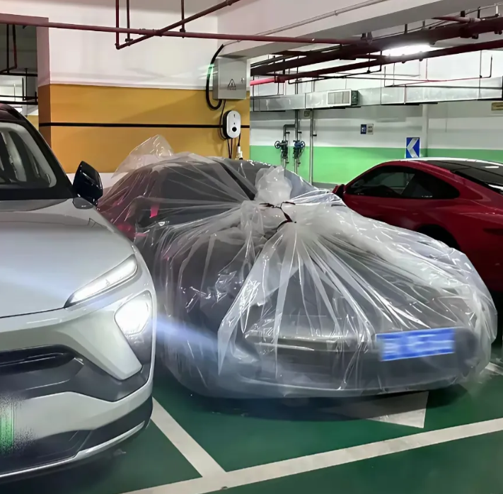 前几天我们这边要下雨,于是在车库看到了这样一幕。 这可不是为了防灰尘,而是为了防水淹车库的应急举措。估计车主之前有过什么惨痛的教训。 但实际上,真要是地下车库进了水,这么做根本就没有任何用处。 我不知道这位车主有没有看过地下室进水的视频,一旦进了水之后,车子就会飘起来,飘的过程中车子又会互相碰撞。 要是碰撞的力道太大塑料膜肯定会破,然后就会进水,所以只包这样一层简单的塑料膜没有什么太大用处。 真要是想保护爱车的话,我建议各位这样做,里头和这位车主一样包塑料膜,而且要确保塑料膜别漏水。 此外在车身的关键位置,尤其是侧面容易和其他车辆碰撞的地方包上一层塑料泡沫,比如快递用的那种,这是用来保护塑料膜的,这样一来基本就没什么太大问题了。