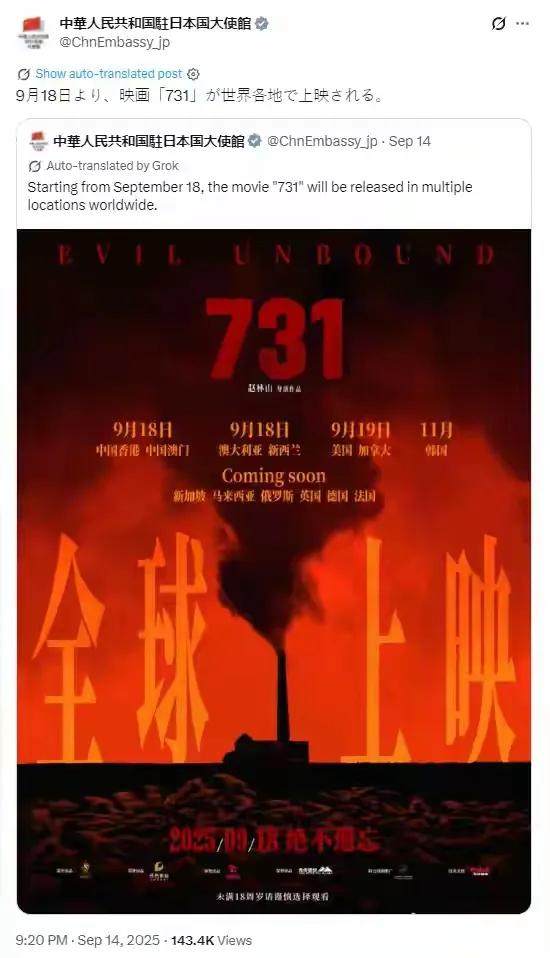 日本网民呼吁上映!日本政府竟怕到让学生躲家里?731真相必须全世界看到! 电影《731》全球上映日程公布,我国使馆转发海报直戳日本政府肺管子,他们一边装聋作哑不认罪,一边紧急发“安全提醒”,连上海日本人学校都吓得改网课——明明是加害者,却演起“受害者”戏码?可笑!他们怕的仅仅是一部电影吗?不止,还有是那些被活体解剖、毒气实验的万千冤魂! 日本网民都比政府清醒,有日本网民表示,“该在日本上映!”“该建博物馆谢罪!”而日本官方只会逃避历史、煽动恐慌。拒不认罪的日本,拿什么谈和平?全世界都该看看这部电影,再看看看看日本人的反应,看看他们遮遮掩掩魔鬼行径的嘴脸!