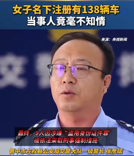 万万没想到!山西,交警排查机动车档案时,发现一女子名下竟有138辆车,其中许多还逾期未年检,就联系对方提醒年检,不料女子却表示,自己只有一辆车,并且车辆处于正常状态,见事有蹊跷,警方便对其展开调查,而结果让人意想不到! (信息来源 :DV现场 2025年9月18日) 小张(化名)是一名交警在工作上他的警觉性十分的强,然而就在前一段时间他在对车辆进行例行排查的时候发现有一女子的名下竟有一百三十八辆汽车,且还有好多车1都是没有进行过年检的,顿时就让他感觉到了不对劲。 于是就赶紧给这名女子打去了电话,提醒女子要赶紧将自己的全部车辆都按时完成车检,女子听了之后很是纳闷觉得自己就一辆车哪来的其它车辆。 女子立马就给交警说是不是打错电话了,这时候面对女子的坚定的语气,小张立马就想到了会不会有人冒充然后用女子的身份挂车,就赶紧问女子身份证最近借过别人没有。 女子想了一下说之前丢过一次后来补办了,就没太在意,小张一听觉得自己的猜想可能是正确的,随后和部门的几个同事立马就开始对此件事情进行了调查。 随后经调查之后发现,女子身份证丢了之后,曾经被王某(化名)捡到了,紧接着他就将捡的身份证给了二手车中介的工作人员,就这样经过他们几个人私底下的不正当勾当之后。 他们利用别人的身份信息来伪造车辆过户的委托书,因为每办理好一辆他们就可以得到相应的金额的补偿,所以面对这样不用出力就可以捞钱的事情他们几个人没有抵住诱惑。 小张在获得确凿的之后,就依规依法对这九名涉案人员采取了刑事拘留措施,以实际行动维护了社会的公平正义。 看到这件事情之后,有一位网友说自己的身份证已经丢失两个月了还没有补办,害怕也出现这样的情况,所以她立马就去补办了一张。 那么通过这件事情也告诉我们了,身份证对于我们的重要性,所以一定要保护自己的身份证如果一旦出现找不到,就立马去补办不然会被人拿去干非法的事情。