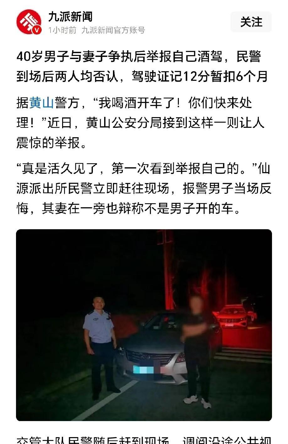 安徽黄山,男子聚餐结束,回家路上和妻子发生争执,他一气之下举报自己酒驾。等帽子叔