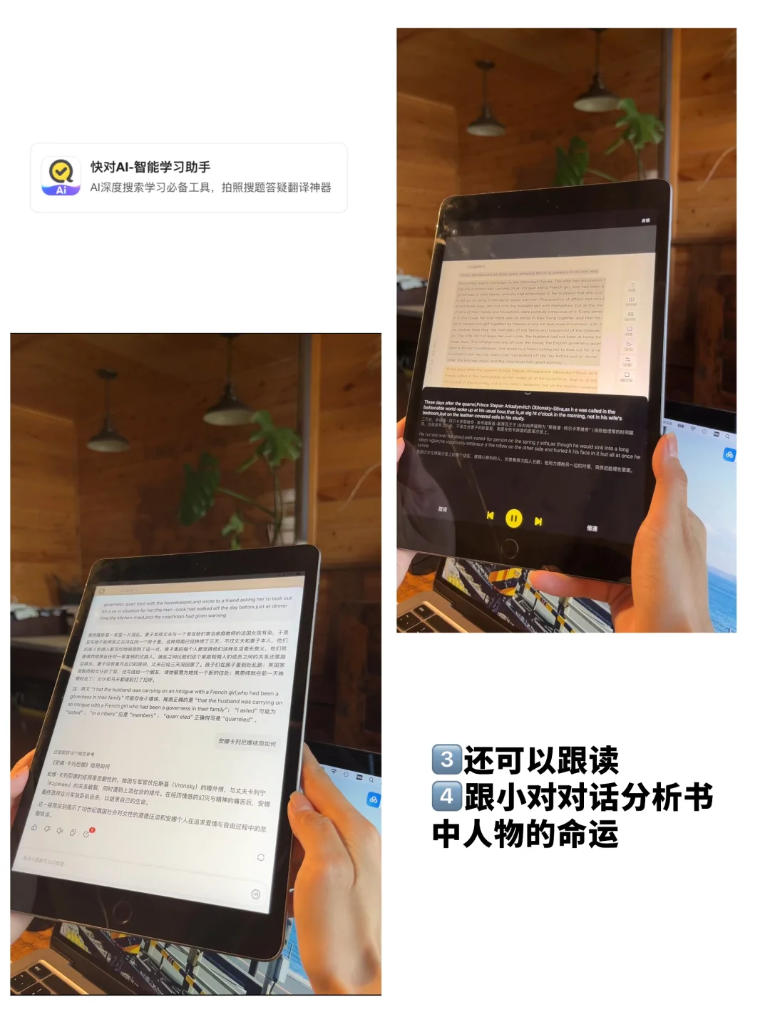 📖其实早就知道书中的故事,主要是提高自己看英文小说的水平,我的英文小帮手是【快对AI 】,点击拍照翻译,它可以快速翻译成中文以外,还可以点击单词看详细的释义,并且可以点击段路跟读,随时跟小对AI对话,谈谈对书中人物命运的分析。
