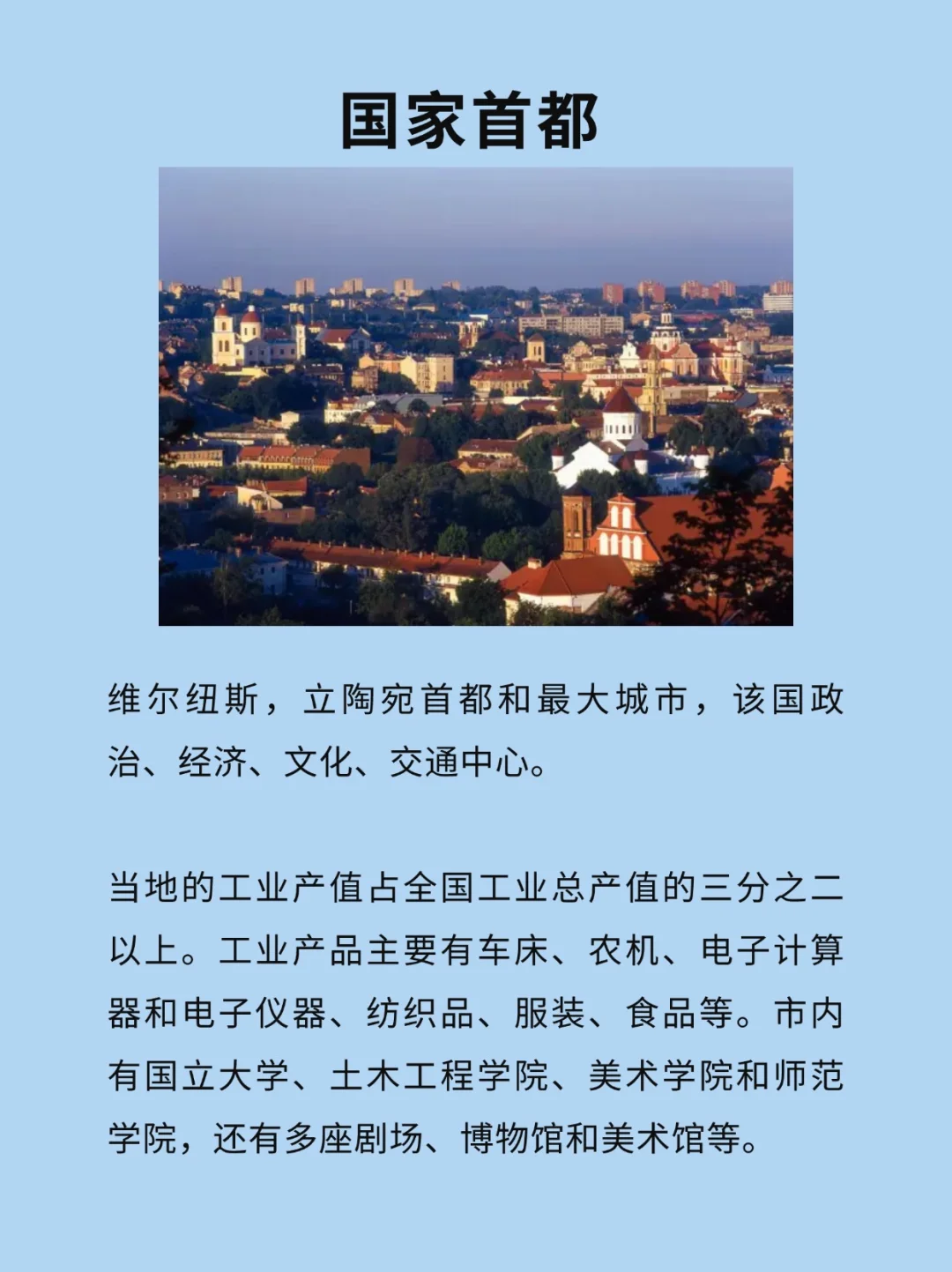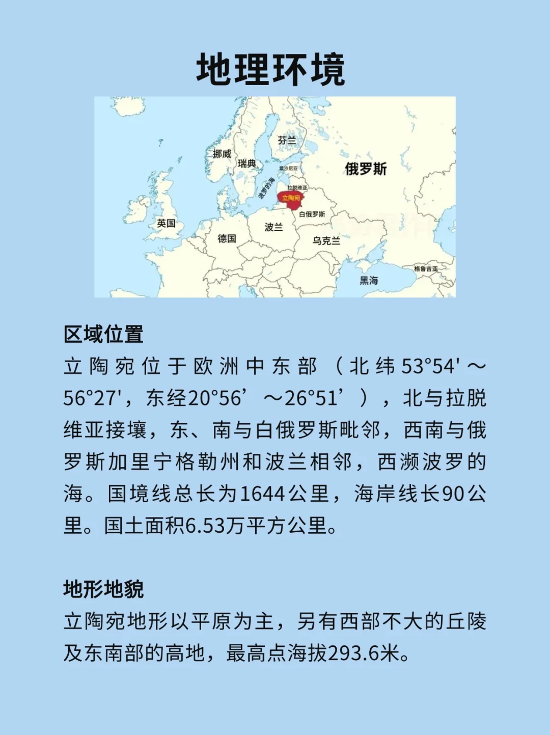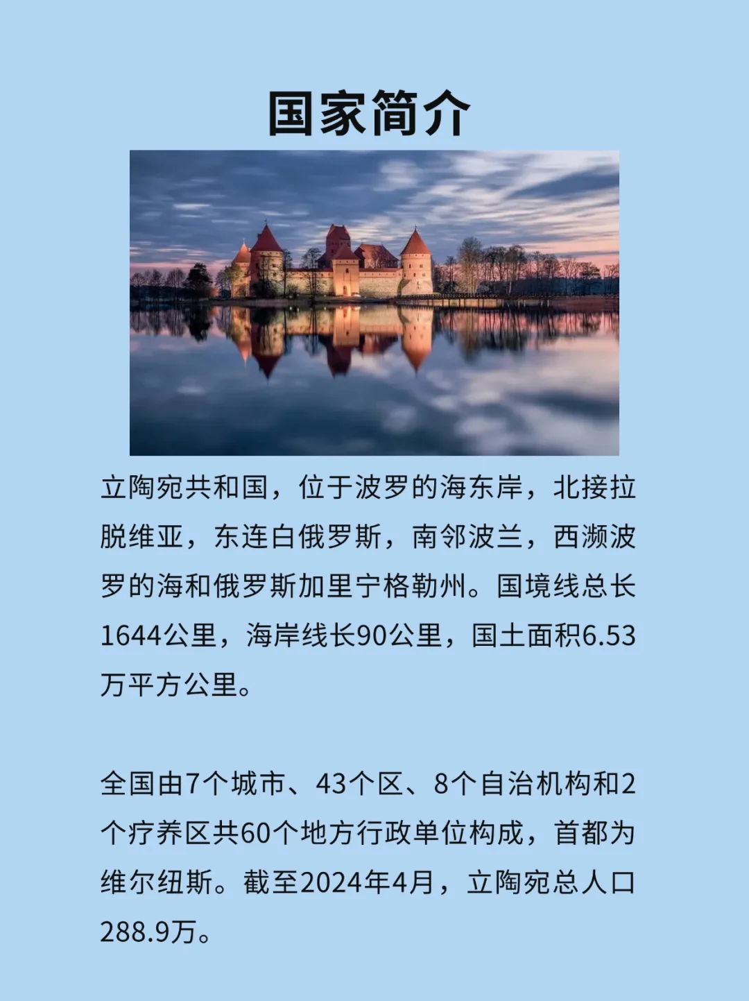 [打卡R]立陶宛共和国,位于波罗的海东岸,北接拉脱维亚,东连白俄罗斯,南邻波兰,西濒波罗的海和俄罗斯加里宁格勒州。 [种草R]国境线总长1644公里,海岸线长90公里,国土面积6.53万平方公里。 [彩虹R]全国由7个城市、43个区、8个自治机构和2个疗养区共60个地方行政单位构成,首都为维尔纽斯。截至2024年4月,立陶宛总人口288.9万。