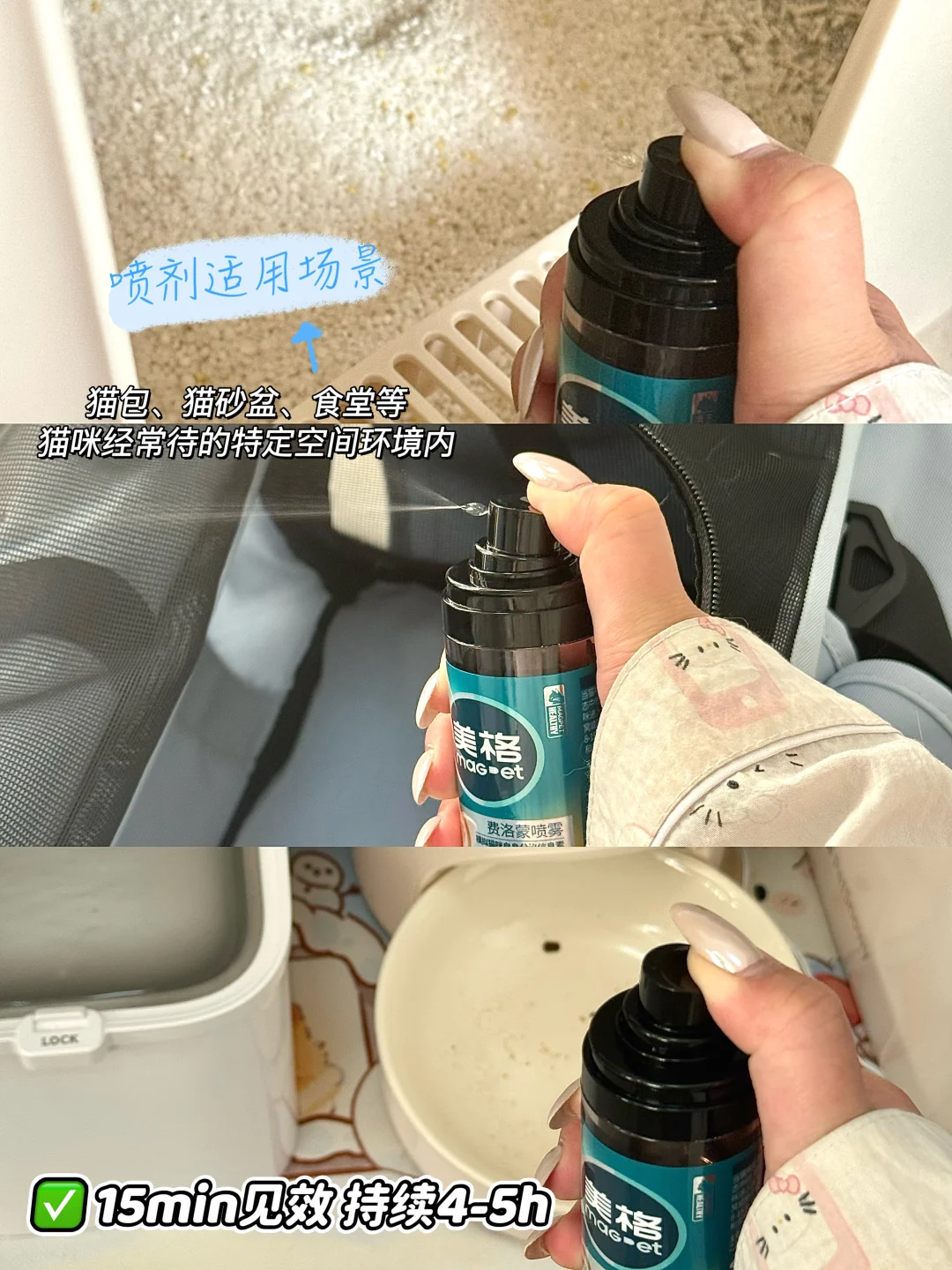平时要带猫咪出门玩或者洗澡 提前在猫咪爱待的场景(猫包、猫砂盆、猫窝等)喷上MAG费洛蒙喷雾 15分钟内生效 持续时间在4-5h左右 同时出门前1h给猫咪吃MAG的费洛蒙胶囊 从根源舒缓猫咪情绪 喷雾+胶囊搭配使用效果1+1>2