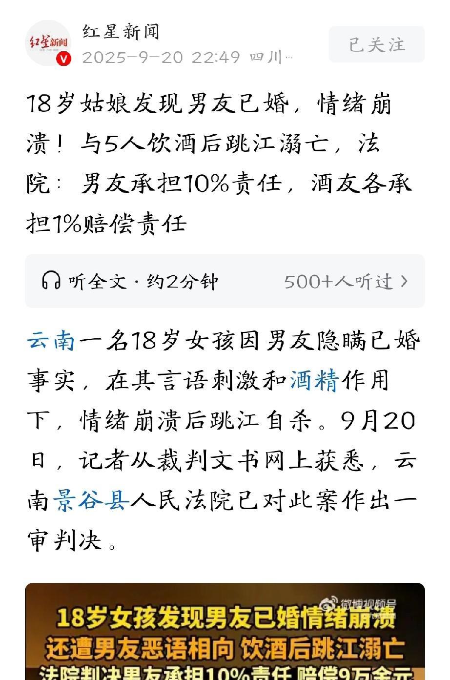 云南普洱,18岁女孩高中毕业后,与一男子相识相恋,情窦初开的她以为自己遇到了真爱,谁知一个多月后,竟得知对方已经结婚,还有孩子。女孩受不了打击和朋友出去喝酒,想要借酒消愁,期间她多次给男友发消息,说“不想活了,永远不要再见”之内的话,本以为男友会挽留她,谁知等来的却是恶语相向。女孩彻底绝望,不顾朋友劝阻,纵身一跃跳入江中溺亡。女孩父母悲痛欲绝,将男子告上法庭,索赔92万,法院的判决令人唏嘘。 据红星新闻9月20日报道,18岁的女孩小张刚高中毕业,情窦初开,满心期待着能邂逅一场美好的爱情。 2024年8月,她认识了男子李某,李某比他年龄大,风趣幽默,也很会照顾人,两人很快发展为恋爱关系。 小张满心欢喜,以为自己终于遇到了真爱,所以毫无保留地投入到这段感情中。 然而,命运却跟她开了个残酷的玩笑。9月13日,小张偶然得知了一个让她如遭雷击的真相,李某竟然有家庭,还有一个孩子。 这个消息狠狠地砸在小张的心上,她怎么也没想到,自己真心以待的人,竟然一直在欺骗她,委屈、痛苦,她感觉自己的天都塌了。 当天下午,心情极度低落的小张,约了多名好友到某农家乐聚餐饮酒,她想借酒消愁,忘掉这段悲伤的过往。 可是,酒入愁肠愁更愁,她的情绪不仅没有得到缓解,反而更加崩溃。 期间,她多次一个人跑到吊桥中间哭,还忍不住给李某发信息,说自己想跳桥,但一直没有得到回应。 朋友陈某一直在旁边劝导她,希望她想开点,往前看,可小张的内心早已千疮百孔,根本听不进去。 20时27分左右,小张最后一次给李某发了信息,说“永远不要见了”。本以为李某能安慰她,说些温暖的话挽留她,可没想到,等来的却是他的恶语相向。 那些刺耳的话语,击碎了小张最后一点幻想,她心如死灰,彻底绝望。 两分钟后,小张给朋友陈某转了500元,还留言“有缘再见”。 陈某看到信息后,感觉情况不对,立马把钱退还,并急忙跑出去找她。 可当陈某赶到吊桥时,只看到小张从吊桥纵身一跃,跳入了冰冷的江水中。 陈某大声呼救,在场有两名男子,毫不犹豫地跳进江中搜救,可是江水湍急,他们找了很久,始终没能找到小张。 直到9月15日,小张的尸体才被发现。 这个消息如同晴天霹雳,让小张的父母悲痛欲绝,他们怎么也无法相信,自己花一般的女儿,就这样永远地离开了。 他们满心气愤,觉得女儿的死完全是因为李某的恶意欺骗。如果不是李某的冷漠和恶语相向,女儿就不会绝望跳江。 于是,小张的父母要求李某赔偿各项损失92.7万余元。 法院经过调查审理,根据《民法典》第1002条规定,自然人享有生命权,自然人的生命安全和生命尊严受法律保护 。 小张作为18岁的完全民事行为能力人,应当对自身生命安全负有最高注意义务,其选择跳江结束生命,是导致死亡后果的直接原因,所以她应自行承担大部分责任。 李某隐瞒已婚事实与小张交往,其行为违背了公序良俗。 另一方面,在小张明确表达自杀倾向时,李某不仅没有予以劝阻,反而使用刺激性语言,让小张的情绪进一步崩溃,其行为存在过错。 共同饮酒的朋友陈某等五人,对小张的人身安全应当负有合理注意义务。 在小张情绪低落、有明显自杀倾向的情况下,他们没有尽到足够的关心和照顾责任,虽然事后有积极救助,但仍存在过错,没人应承担1%的赔偿责任。 综上,法院最终判决,李某赔偿92771.4元,陈某等同饮的五人,每人赔偿9277.14元。