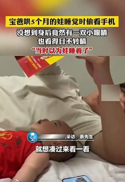 这下好了,不仅老婆知道了,全网都知道了! 河北,男子好不容易把5个月大宝宝哄睡,终于能玩会儿手机,结果,宝宝竟然是装睡,在看到爸爸翻身之后,竟然偷偷爬到枕头上,目不转睛盯着爸爸手机,爸爸也完全没发现,直到妈妈洗澡回来,就看到父子俩的姿态,顿时气不打一处来!说好的哄娃睡觉,就是这样的? 据武义融媒9月21日报道,一名奶爸在将孩子哄睡了之后,就偷偷的侧到一边看手机,令他意想不到的是候在他的背后竟还有一双小眼睛在后面紧紧的盯着屏幕。 那天晚上翟女士(化名)看到丈夫在床上很清闲,于是就让他去哄孩子睡觉,说完之后翟女士就去洗澡了。这时候的丈夫直接上演了一场手忙脚乱。 怎么哄孩子孩子都不愿意睡觉,就这样丈夫哄了整整三十分钟才将孩子哄睡。随后等他觉得孩子终于睡熟了之后,就将自己的身子侧去了一边开始刷视频了。 这次期间为了不打扰孩子,操作得十分谨慎,不仅将屏幕亮度调到最低,甚至就连声音和通知都干全部关掉了,生怕一点点动静惹醒孩子。 不料孩子根本就没有进入熟睡的状态,但他看到父亲在看手机的时候,就立马将自己的脑袋靠在了床头柜上,然后将全部注意力都放在手机屏幕上面。 然而等翟女士洗澡回来的时候,正好看到了这一幕,爸爸低头玩手机,孩子睁大眼睛在旁边观察,她当时火气直冒,觉得丈夫没顾好孩子,当场嗓门提高了。 随后当她仔细一看,发现孩子那副专注盯着屏幕的样子让她忍不住笑出声,还顺手录下视频传上网。 视频一出,立刻引来无数评论。网友们笑称这是“带娃现场的翻车”,还有人编段子调侃。 不过大家也认真地聊起了问题:这么小的孩子盯屏幕,对眼睛和大脑发育都不好。其实在孩子还这么小的时候,正是好调教的的时候,所以在卧室里面可以尽可能得给孩子营造干净的休息氛围,让他从小就养成习惯。 如果家长要是真的很想玩手机,可以换个地方,既满足自己,也不给孩子制造“榜样偏差”。 手机已是日常的一部分,但在孩子面前如何使用,怎么平衡责任和个人放松,才是真正的考验。那么对于这件事情你还有什么想说的吗?