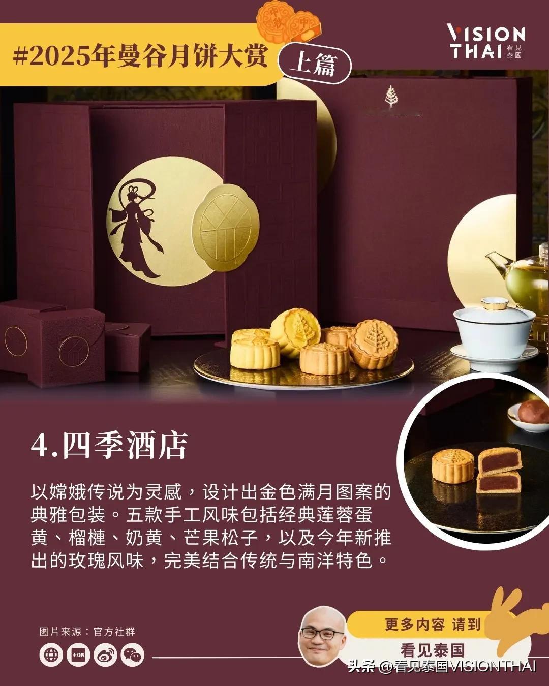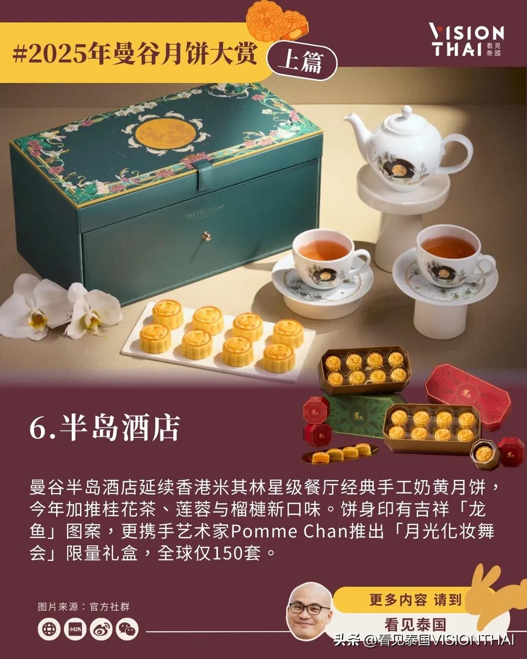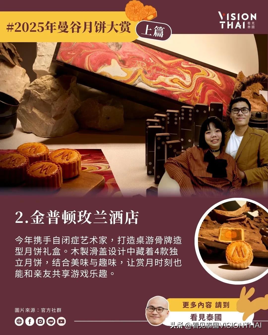 【23间曼谷酒店月饼大赏(上篇)】 泰国也过中秋节!随着中秋脚步渐近,各大曼谷酒店纷纷推出精心设计的月饼礼盒,结合传统文化与现代创意。看见泰国小编汇整了23间知名曼谷酒店推出独具特色的中秋月饼,分成上、中、下三篇为大家逐一介绍,让异乡游子品尝泰式风情的月饼。 本篇(上篇)精选8家曼谷酒店,从「新通凯宾斯基」的榴莲绿茶开心果创新组合、「金普顿玫兰」的月相主题美学、「康莱德」的红宝石灵感手工制作,到「四季酒店」的嫦娥传说包装、「文华东方」的经典奢华工艺、「半岛酒店」与艺术家联名的限量典藏版、「柏悦酒店」的蛇年泰式优雅设计,以及「瑞吉酒店」的传统创新融合。这些曼谷月饼不仅口味独特,包装设计更是各具巧思,让让你体验泰国中秋节精致的味蕾飨宴。 原文:-hans/article/2025-moon-cake-bangkok-hotel-1/ 看更多:-hans/