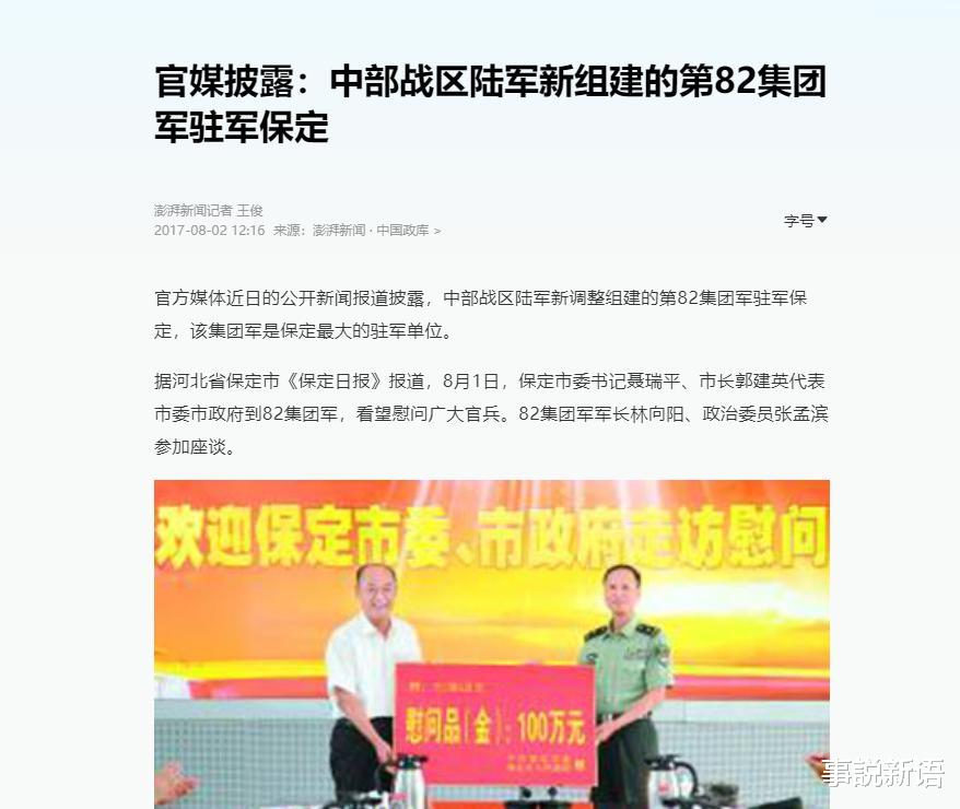 在军改结束以后,官方媒体就透露了消息,82集团军目前驻扎在河北保定,这也是保定当地规模最大的一个驻军单位。