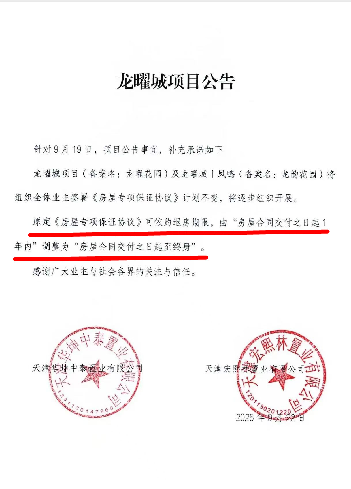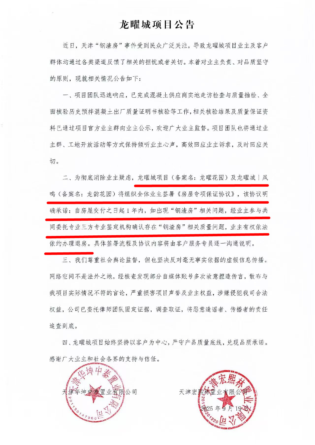 这一波操作必须点赞!虽然闹出“钢渣房”事件的不是龙曜城,但因为代建方是龙湖,龙曜城不仅没有回避,还积极作出了反馈,该查查、该检检,并且还敢签《房屋专项保证协议》,承诺若出现“钢渣房”相关问题,可以退房!为了彻底打消买房人疑虑,甚至将一开始承诺的“交付之日起1年内”延长到了“终身”!也就是说,交房后无论什么时候出问题,都可以退!