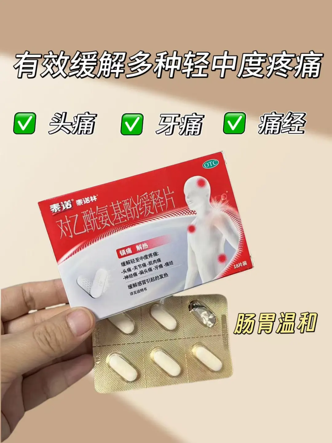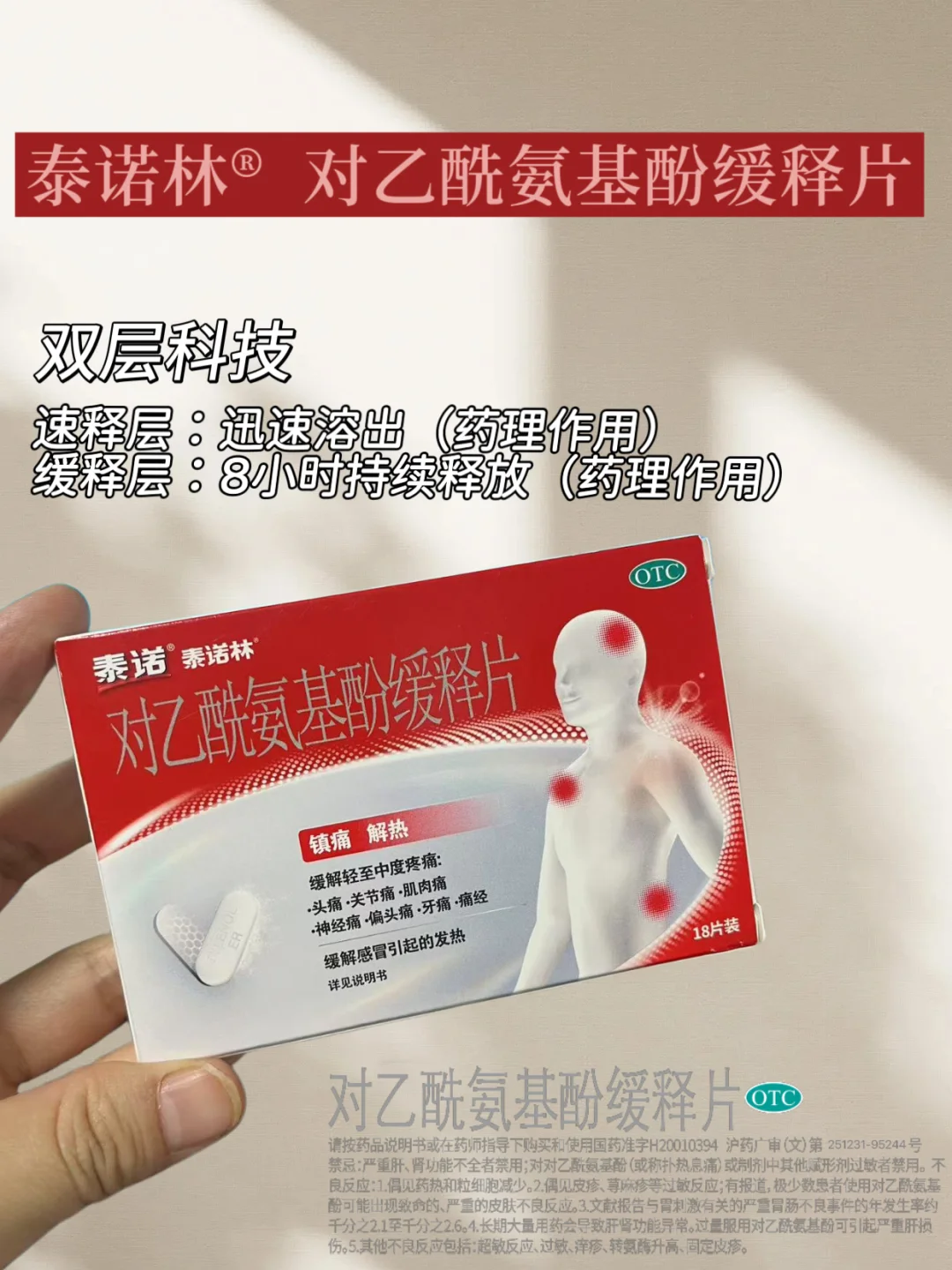 泰诺林® 对乙酰氨基酚缓释片 有效缓解多种轻中度疼痛 像是头痛、牙痛、痛经 还能缓解普通感冒或流行性感冒引起的发热 其中采用了双层科技:✅速释层✅缓释层 速释层:迅速溶出(药理作用) 缓释层:8小时持续释放(药理作用) 且肠胃温和