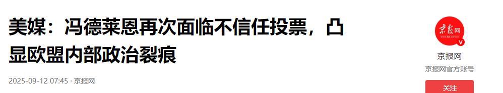 冯德莱恩,再见了!欧盟再次出手,必须换人 9月23日消息,欧洲议会中势不两立的极右翼与左翼党团,竟罕见地同时对她发起不信任动议,计划在10月投票中决定其去留。 冯德莱恩选择让欧盟的外交政策完全跟随美国。这条路线被坚决执行,一轮又一轮的对俄制裁,在政治上确实展现了团结的姿态,但沉重的代价却悄悄压在了欧洲普通人的生活成本上。 负面影响很快显现。德国一些工厂因能源价格过高直接停产,法国家庭开始为冬天高昂的取暖费发愁。 匈牙利、斯洛伐克等东欧国家更是怨声载道,他们感觉自己的国家经济,无辜地成了布鲁塞尔政治“表演”的牺牲品。 面对质疑,冯德莱恩的回应一贯强硬,她坚称对俄罗斯妥协就是背叛欧洲的价值观。但这种宏大的说法,对于那些在寒风中面对天价账单的普通人来说,毫无说服力。 对俄政策引发了普遍的经济阵痛,而摇摆不定的对华政策,则进一步加剧了商界的困惑与不满。 冯德莱恩不久前还在强调与中国合作的必要,转眼间,欧盟委员会就突然宣布要对中国的电动汽车加征关税。 这种名义上的“去风险”操作,最先伤害的却是欧洲自己的企业。德国汽车品牌在中国市场的日子愈发艰难,欧洲的光伏产业也因供应链问题叫苦不迭。许多企业主无法理解,为什么委员会的决策看起来总是在帮倒忙。 外部的压力与内部的矛盾,让冯德莱恩的执政联盟从根基上开始松动。她主导的一些贸易协议,比如同美国和南美国家的谈判,彻底惹怒了右翼阵营,他们批评她这是在出卖欧洲农民的利益。 就连曾经的盟友也感到被背叛。冯德莱恩曾向社会党许诺,会保留一项关键的欧盟社会基金,以换取他们在七月投票时支持自己连任。 但社会党很快失望地发现,她在一些环保法案上,正和他们视为死敌的极右翼暗通款曲。 过去的执政伙伴绿党也发出了最后通牒。经历了一个酷热的夏天和持续的能源危机后,他们要求冯德莱恩拿出彻底的改革方案,而不是用老一套说辞敷衍。言下之意很清楚,我们的支持,随时可以收回。 现在,所有的矛盾都汇集到了十月的这场不信任动议上。罢免冯德莱恩的程序门槛极高,需要议会超过三分之二的同意票。但这次动议的真正杀伤力,根本不在于最终结果。 它暴露了一个更深层的问题,不信任动议这个严肃的监督工具,正变得越来越廉常态化。在欧洲议会,发起这项动议的门槛很低,这让它成了一种好用的政治施压工具。左翼已经放话,他们很快又能凑齐签名,发起下一次。 这种永无休止的挑战,就算一次都成功不了,也足以让整个欧盟委员会陷入无尽的内耗和扯皮。 而一位议员忧心忡忡地表示,在真正的经济和民生问题面前,欧洲已经承受不起这种代价高昂的制度空转了。 实际上,冯德莱恩一个人的困境,不过是整个欧盟困境的缩影。她下台与否,并不能解决那些根深蒂固的矛盾,东西欧之间的利益冲突,南北欧之间的经济鸿沟,以及在产业、能源、对外关系上的根本分歧。 十月的投票会有一个结果,但真正的问题依旧悬而未决。内部分裂已经如此严重,换掉谁,恐怕都无济于事。笔者也不禁会想,欧洲,还能就未来的方向达成共识吗? 信息来源:《美媒:冯德莱恩再次面临不信任投票,凸显欧盟内部政治裂痕》,京报网,2025年9月12日。