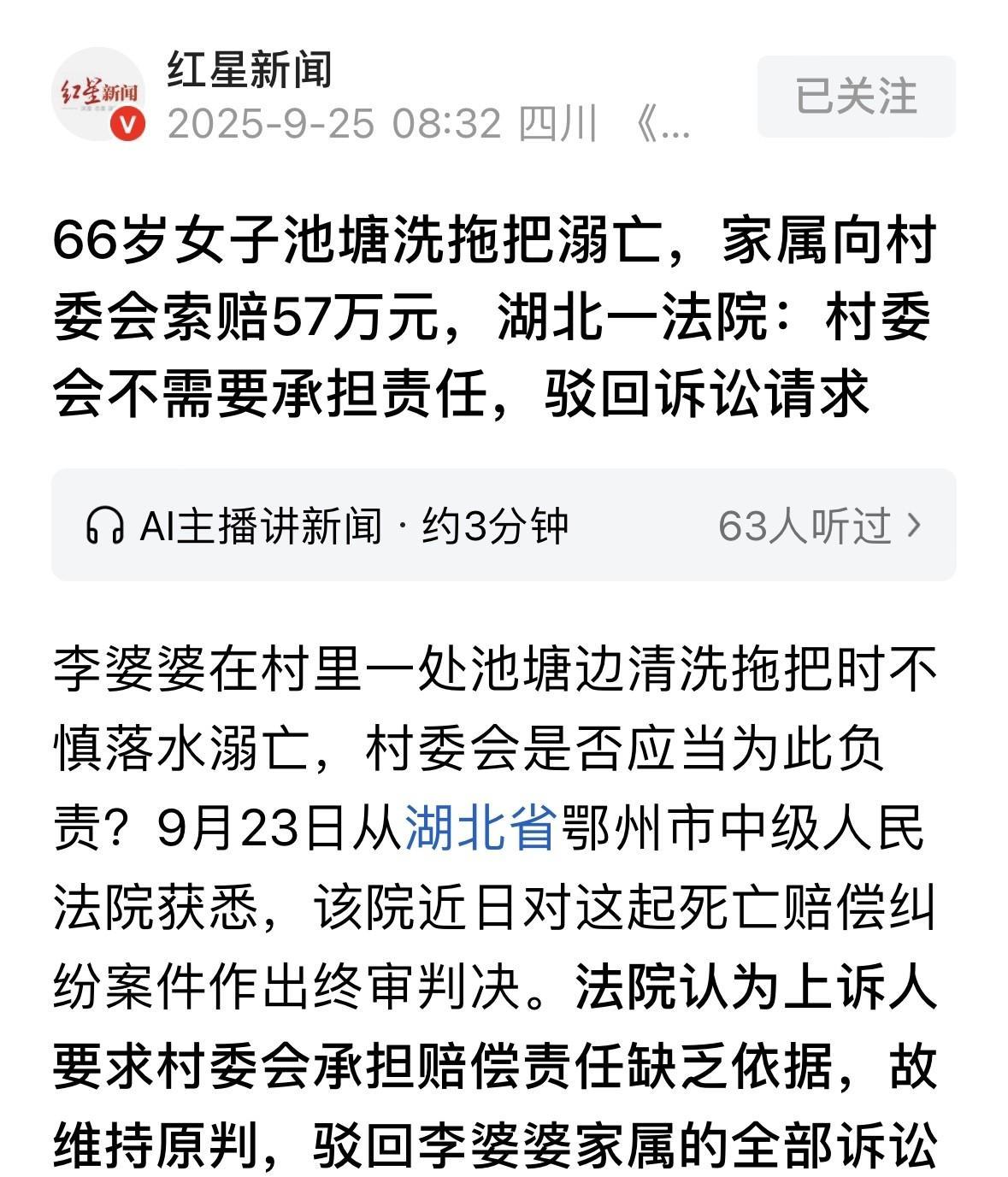湖北鄂州,6旬老太在村里池塘边洗拖把,结果脚下一滑,意外落水身亡了,事后家属把矛头直指村委,说池塘连个围栏都不修,否则老太太也不会没,家属告到法院索赔57万,案子经过一审二审,法院判了! 2024年7月,66岁的李婆婆像往常一样到村头池塘边洗拖把。 这池塘是村里老辈儿们留下的,四四方方,边上砌着水泥围挡,还留着三阶台阶通到水里,方便村民取水洗衣。 谁承想,那天李婆婆脚底一滑,栽进水里,等救上来送医院,人已经没了。 李婆婆走后,家属们把矛头直直指向村委。 他们觉得,这池塘是村委会管的,前两年还挖深过,挖的时候没想着加个护栏啥的,这才让老人出了事。 于是,家属们一纸诉状把村委会告上法庭,张口就要57万赔偿。 可村委会这边也有话说。 村主任表示,清淤挖深池塘是给大伙儿办好事,不是瞎折腾。 再说这池塘边上留的台阶、围挡都是按农村习惯来的,总不能把全村的池塘都圈的像个游泳池吧? 一审法院查后发现,池塘边上确实砌着半人高的水泥围挡,留的那个空档也是为了方便村民取水,台阶都修得稳稳当当。 法官认为,村委会管池塘,更多是管管卫生、协调用水这些行政上的事,日常维护还得靠村民自己。 李婆婆在村里住了一辈子,这池塘啥样她清楚得很,下水洗拖把的台阶她走了多少回,咋还能出事呢? 说到底,还是自己没当心。 眼看着一审没打赢,李婆婆家属不服气,又跑到中院上诉。 有人认为,家属的思维就是有枣没枣,都想打两杆试试,万一呢,是吧? 只要不是在家死亡,咋地都得找个人赔钱,是这么个逻辑吗? 那么,从法律角度,怎么看待这场官司? 根据法院查明的事实,池塘是历史形成的农村公共水域,配套建设符合农村用水习惯。 池塘用了三面水泥围挡、三级台阶设计,且留有生活用水空档,已满足“合理限度内的安全保障义务”。 法院认为,农村池塘不同于城市商业场所,管理职责应结合农村自治习惯界定,村委会已通过物理防护,比如围挡、台阶履行了基础安全义务,不存在“未尽到安全保障义务”的过错。 所以,家属以该条款主张赔偿缺乏依据,法院不予支持。 李婆婆作为长期在村里生活的成年人,对池塘的环境,比如水深、台阶位置、围挡高度完全熟悉,她选择在无防护栏的空档处清洗拖把,属于“自甘风险”行为。 法院明确指出,成年人对日常活动中的固有风险应具备基本判断能力,李婆婆未能谨慎防范风险,她的自身过错是导致损害的主要原因。 根据“过错相抵”原则,村委会即使存在轻微管理疏忽,也因李婆婆的重大过失而免除责任。 二审时,家属搬出更多证据,说村委会没及时补上安全措施,池塘太深太危险。 可法院调取了现场照片、施工记录,又问了村里老人,发现这池塘从老辈子起就这么用,台阶、围挡都是按农村过日子的规矩修的,没啥特别危险的地方。 再说,村委会清淤是给大家谋福利,又没干违法的事。 最后,中院法官拍了板,认为村委会的职责不能无限扩大,这池塘本来就是村民日常洗洗涮涮的地方,配套设施都是按农村习惯来的,没藏着掖着啥特别危险。 李婆婆自己作为成年人,对池塘的深浅、台阶的高低都清楚得很,下水时没留神,责任还得自己担着。 最终,家属们二审还是败诉了。 有人说,就不应该维持原判,如果起诉不成立,应该判死者家属反向村委会赔款他们申请的金额,只有这样才能真正打击讹诈现象。法律一定要让诬陷与讹诈有成本。 对于这件事,你怎么看? 信源:红星新闻 2025-9-25 欢迎关注@一案一论