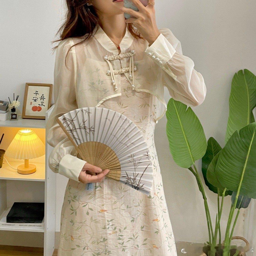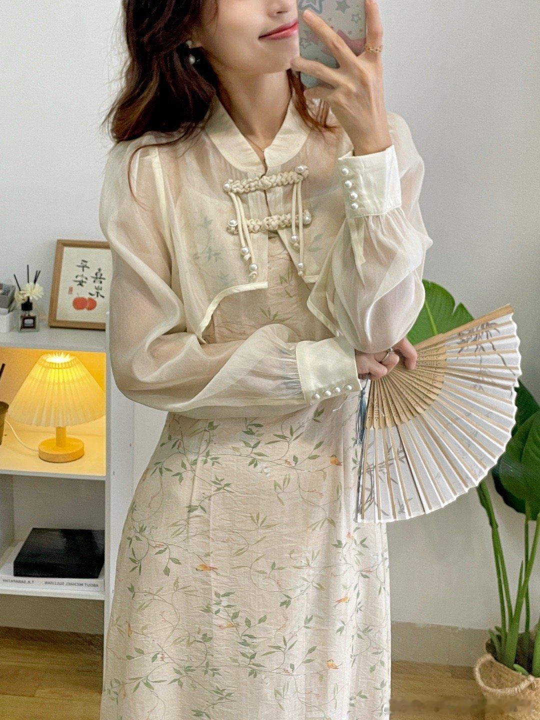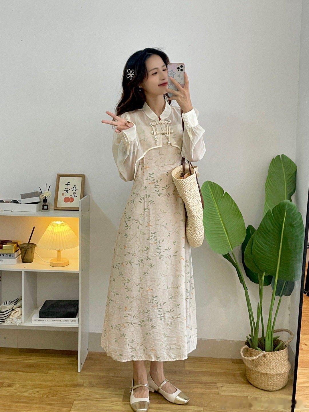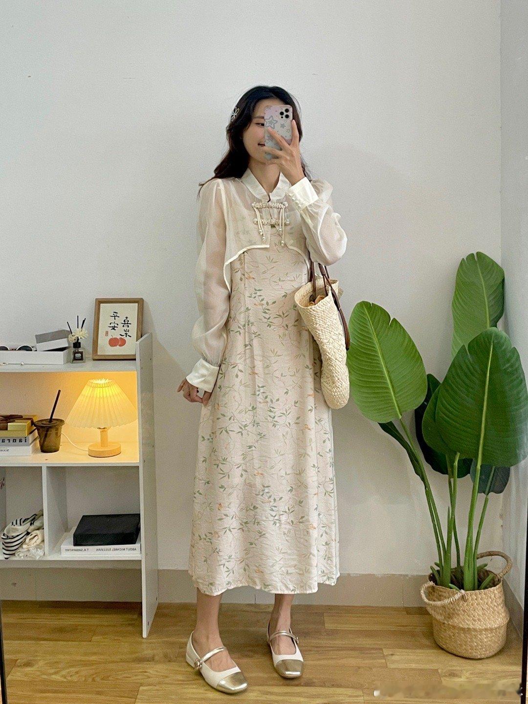 这套新中式穿搭真的美到心坎里!碎花吊带裙温柔又雅致,搭配带盘扣的轻纱小外搭,古典韵味直接拉满~拿把折扇一摆,走在江南小巷里都毫无违和感!