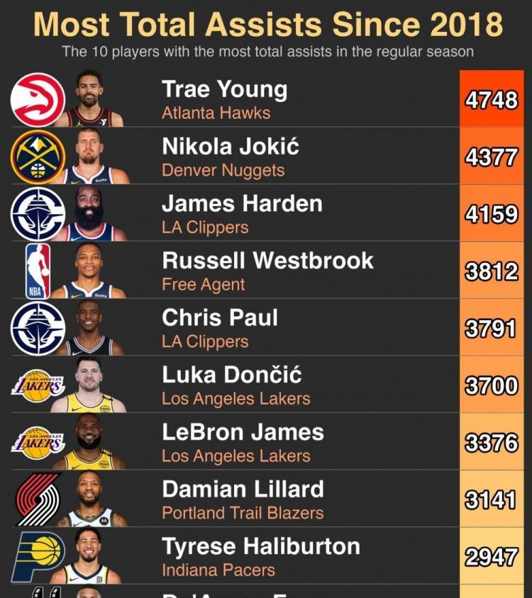 2018年至今助攻数TOP10: 1、特雷杨:4748次 2、约基奇:4377次 3、哈登:4159次 4、威少:3812次 5、保罗:3791次 6、东契奇:3700次 7、詹姆斯:3376次 8、利拉德:3141次 9、哈利伯顿:2947次 10、福克斯:2942次 (美媒HoopsHype统计) 这10个人里面,只有约基奇和詹姆斯不是后卫,一个人称组织中锋,一个是组织前锋,都是NBA第一档的传球手。 生涯有助攻王的球员包括:特雷杨、哈登、威少、保罗、詹姆斯、哈里伯顿。 而这里面,最有希望快速拿到助攻数据攀爬助攻榜的球员就是东契奇了,他生涯至今才打了7个赛季,生涯场均助攻已经到了8.2个,还有巨大的上升空间,只要保持健康,东契奇大概率会完成生涯10000+助攻的壮举。 目前生涯10000+助攻的桌子上,也就坐了7个人,斯托克顿、保罗、基德、詹姆斯、纳什、马克杰克逊、魔术师,威少和哈登也有希望上桌,而东契奇就有可能是第10人了。