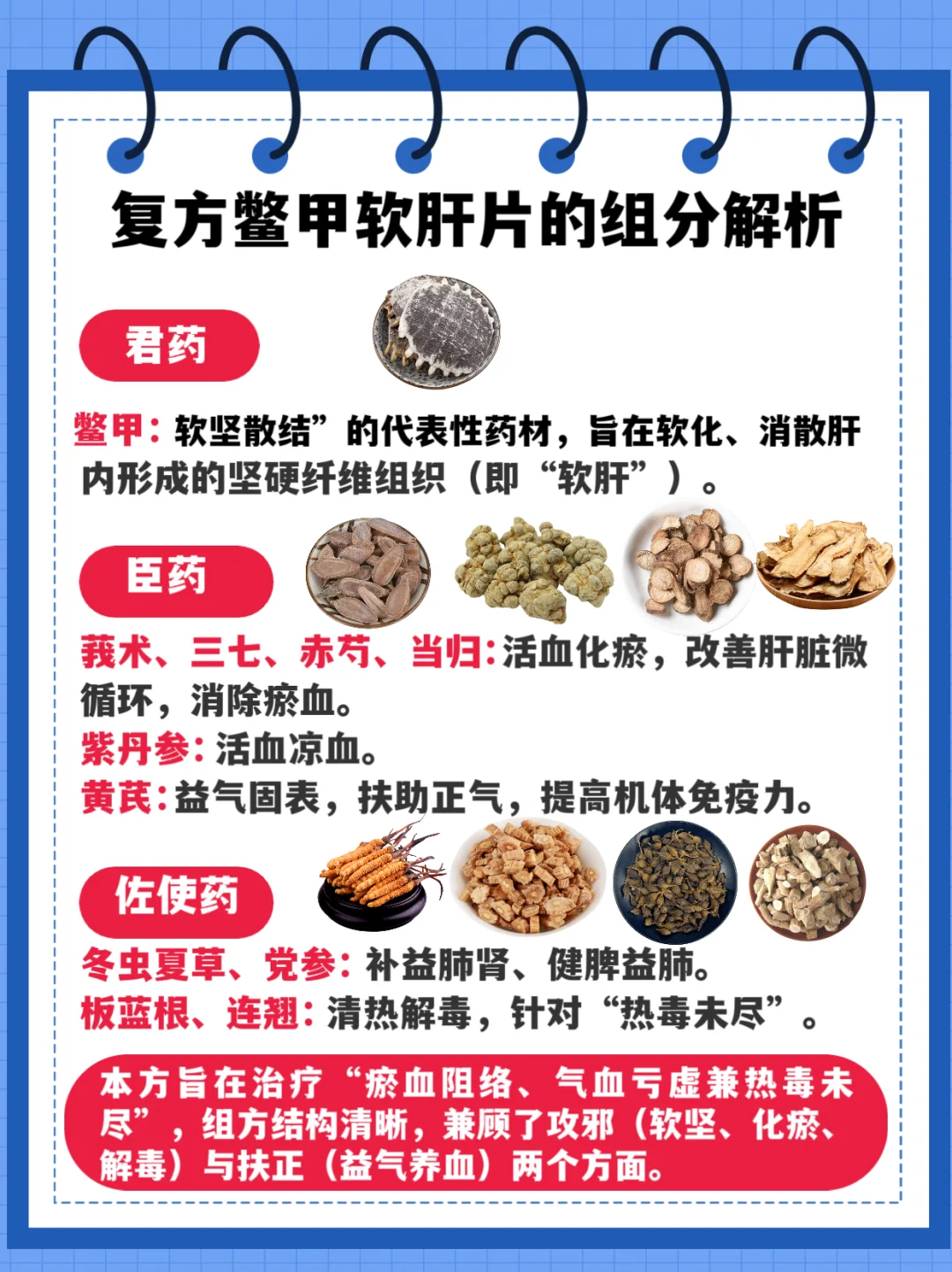 鳖甲:软坚散结”的代表性药材,旨在软化、消散肝内形成的坚硬纤维组织(即“软肝”)。
