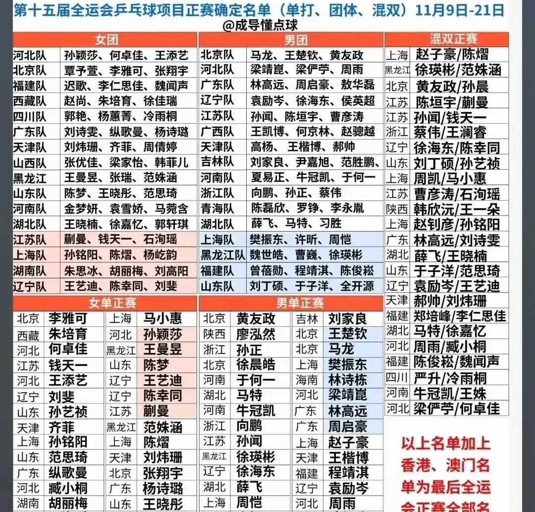 看了一下这次的签表,北京大满贯混双比赛的出场名单,的确有部分是照顾到了接下来即将要举行的全运会。 按照之前的惯例,正常应该是蒯曼与林诗栋的组合,但因为蒯曼与陈垣宇即将代表江苏参加大湾区的全运会,所以这次大满贯就干脆让他俩上了。 王艺迪的搭档一般都是林高远,但因为她和袁励岑的组合已经晋级大运会最后的混双正赛,所以,北京大满贯的混双就是她和袁励岑直接上了。 而陈熠和黄友政的搭档,以及薛飞和钱天一的搭档,那都是常规组合,之前在很多支线赛中表现还可以。 至于王楚钦和孙颖莎就不用多说了。 只不过,她俩的组合早早就要遇上蒯曼和陈垣宇两人,这有点……呵呵。 希望都能打出各自的风格吧!加油!