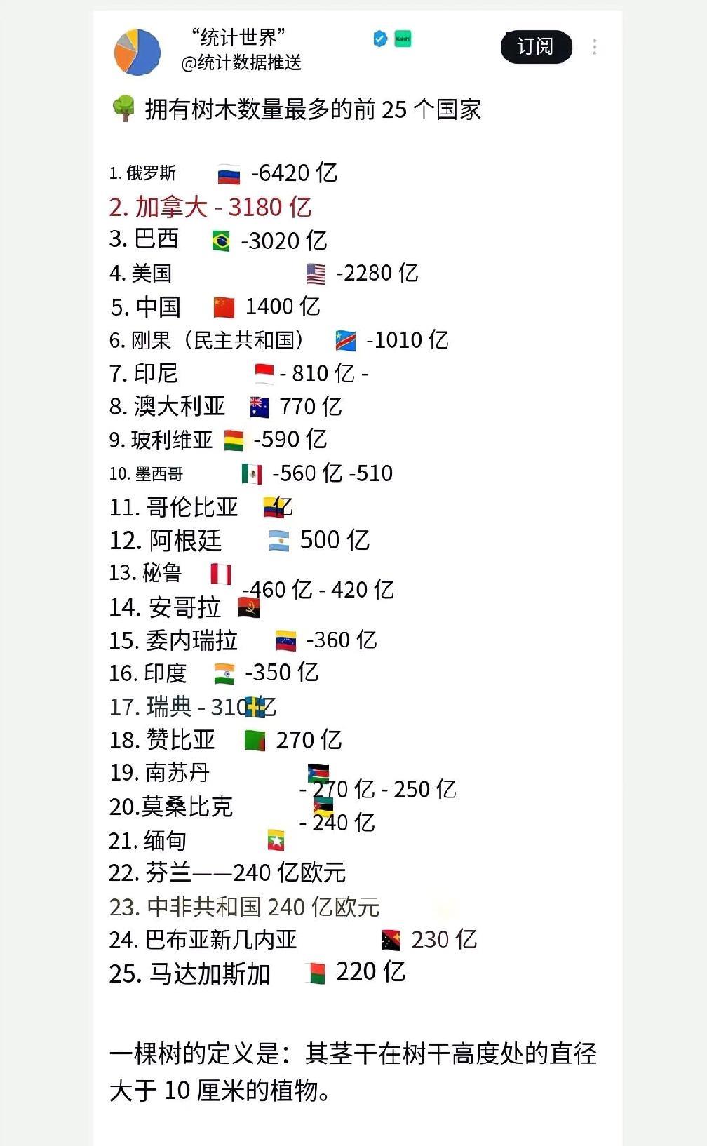 附图为拥有树木资源最多的25个国家排名,中国排在第5位。前4名为:俄罗斯、加拿大、巴西和美国。 我们也跻身到了世界森林资源大国之列,太不容易了。现如今“绿水青山就是金山银山”深入人心,中国已经成为全球“增绿”最多最快的国家。近十年间,中国新增森林面积相当于再造一个法国。我们以全球四分之一的增量领跑世界“增绿”进程。