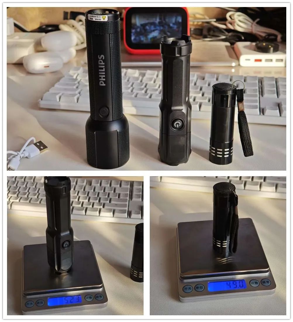 我拿它跟我另外两个手电筒比了一下身高,实测长度是130mm,直径是35mm。它全身一点金属材料都没有,整个就是塑料外壳,一上手就是轻飘飘的感觉。虽然盒子上写净重75克(含电池),但我实际称重才52.3克,跟我另一个mini手电筒(49克)差不多重。